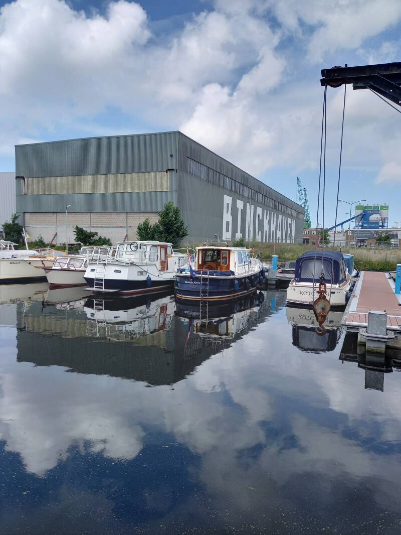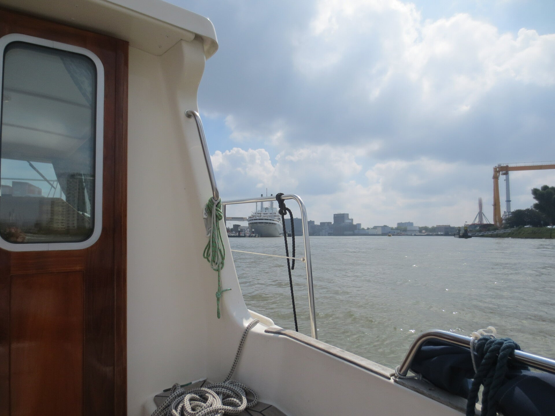 We waren net de Beukelsbrug over de Delfshavense Schie in Rotterdam door richting Parkhaven toen de schroef vast sloeg. Na wat achteruit/vooruit de boot naar de wal kunnen sturen. We konden goed aanmeren langs een soort parkje. Er stonden zelf bolders aan de kant. Zwembroek aan en overboord. Er bleek een Jumbo tas in de schroef te zitten. Deze tas er goed uit kunnen krijgen. Tas in de vuilnisbak van het parkje gegooid. Hierna de reis weer voortgezet.