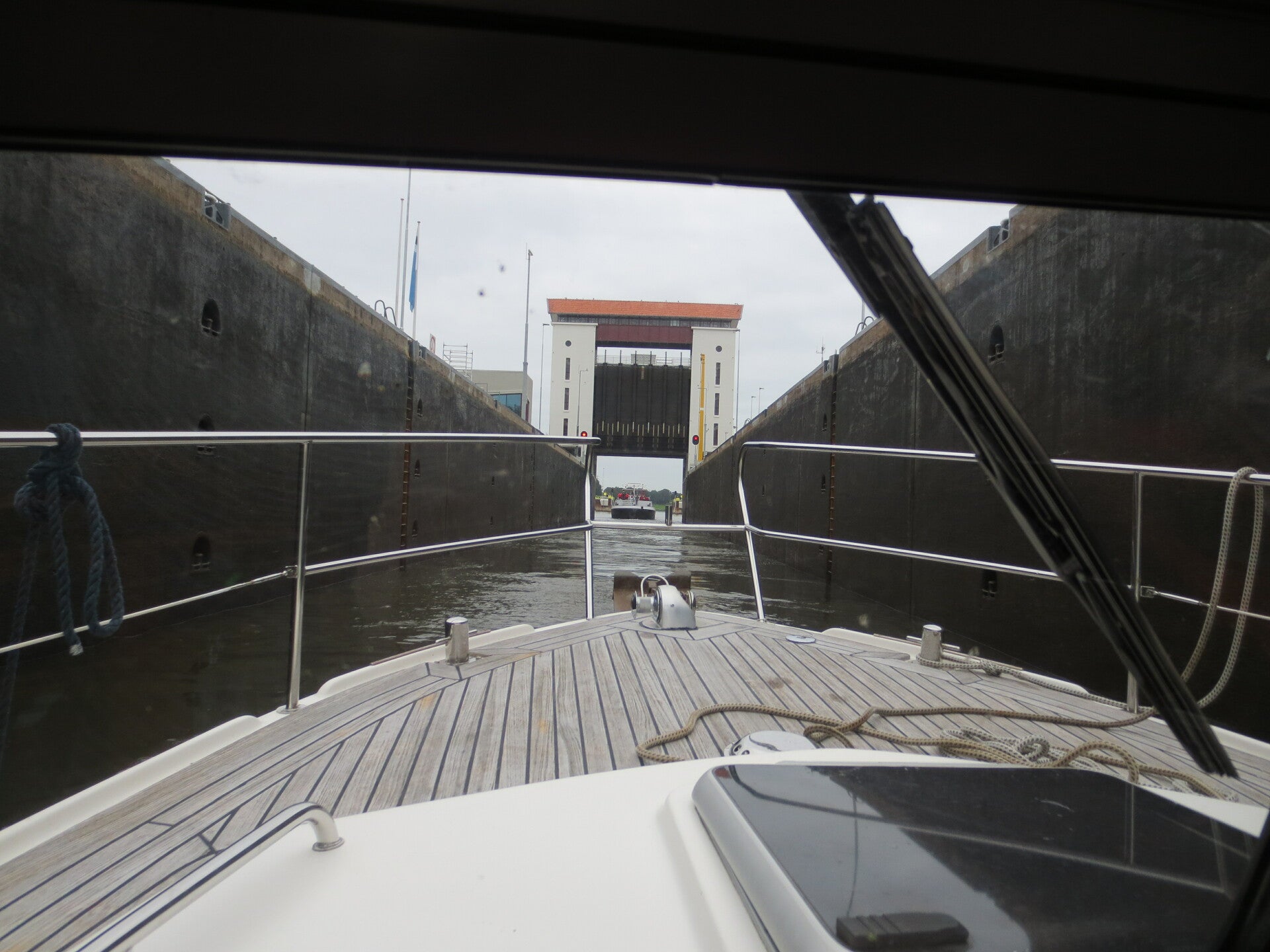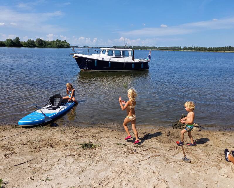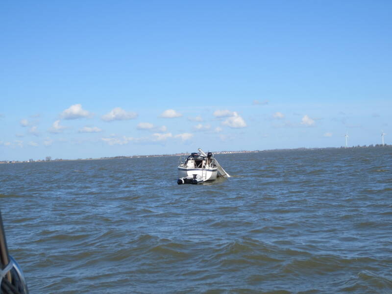 Onze buren met een Everson 900 motorboot op Schiermonnikoog gingen net iets eerder weg dan wij (2 uur voor hoog water). Na 200 meter buiten de haven raakten zij net even naast de smalle vaargeul doordat de stroming en de wind dwars op de vaargeul stond. Ze konden zelf niet vrij komen doordat de wind en stroming hun steeds verder op de zandplaat dreef. Wij hebben een drijflijn met een ankerbal naar hun toe gegooid/laten drijven. Dit heeft even geduurd. Nadat de lijn vast was aan hun boot begon het slepen. Dit ging niet makkelijk door dwars stroming en de wind. Gelukkig kwam de boot los en konden ze hun reis voortzetten. Al goed eind goed.