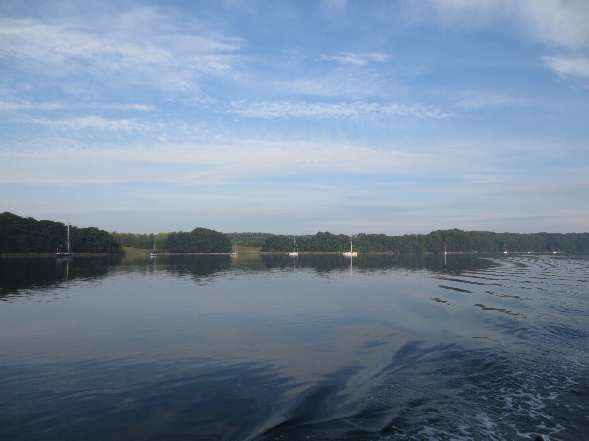 Wij zijn om 04.30 uur vertrokken vanaf onze ankerplek richting het eiland Aarø om de tegenstroom in de Lille Baelt bij Middelfart te ontlopen. Dit is niet geheel gelukt op een gegeven moment kregen we toch nog 4 km stroom tegen. Het was een mooie tocht die eerst nevelig begon. Onderweg veel tuimelaars gezien en ook mooie ankerplekken die door de weekenders werden benut. Op Aarø aangemeerd naast de reddingsboot. De reddingsboot is niet zo uitgebreid uitgerust als de boten van de KNRM. Wij hebben de fietsen uitgepakt en het gehele mooie eiland rondgefietst.