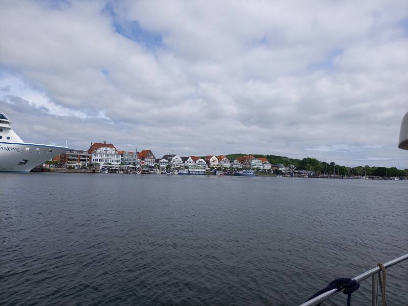 Vanmorgen om 10.15 zijn wij vertrokken uit Lubeck. We werden uitgezwaaid door onze kennissen van de Kent Club. We hadden op de rivier de Trave 2 km stroom mee. De bedoeling was om naar Travemunde te varen. Het was mooi weer met een zacht windje dus we dachten laten we maar wat doorvaren. Onderweg hebben wij diverse bruinvissen gezien. Uiteindelijk zijn we na een mooie tocht aangekomen in Grossenbrode. We zullen er morgen wel moeten blijven in Grossenbrode want het gaat hard waaien.