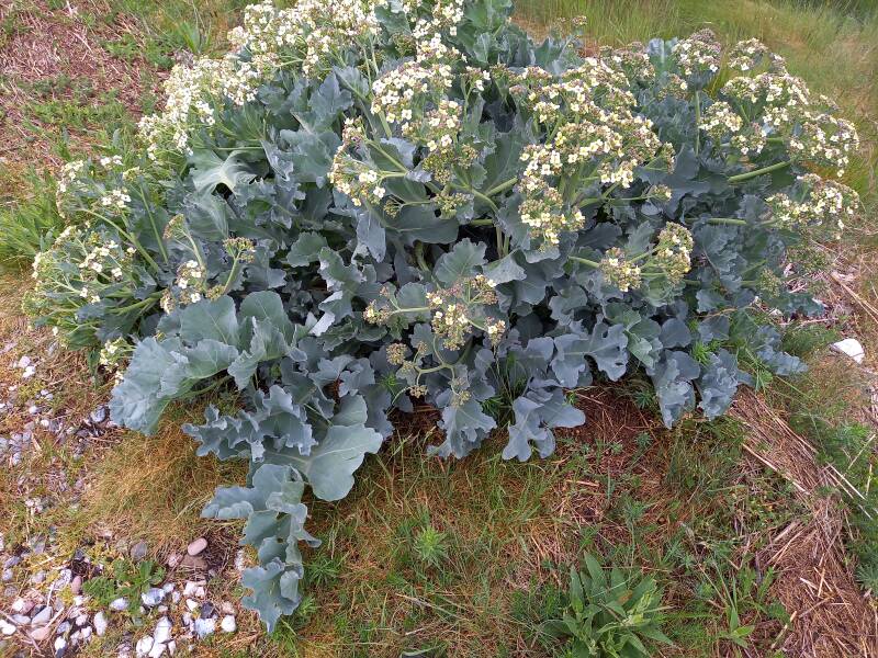 Onderweg veel eetbare struikjes Zeekool op het strand (familie van broccoli)