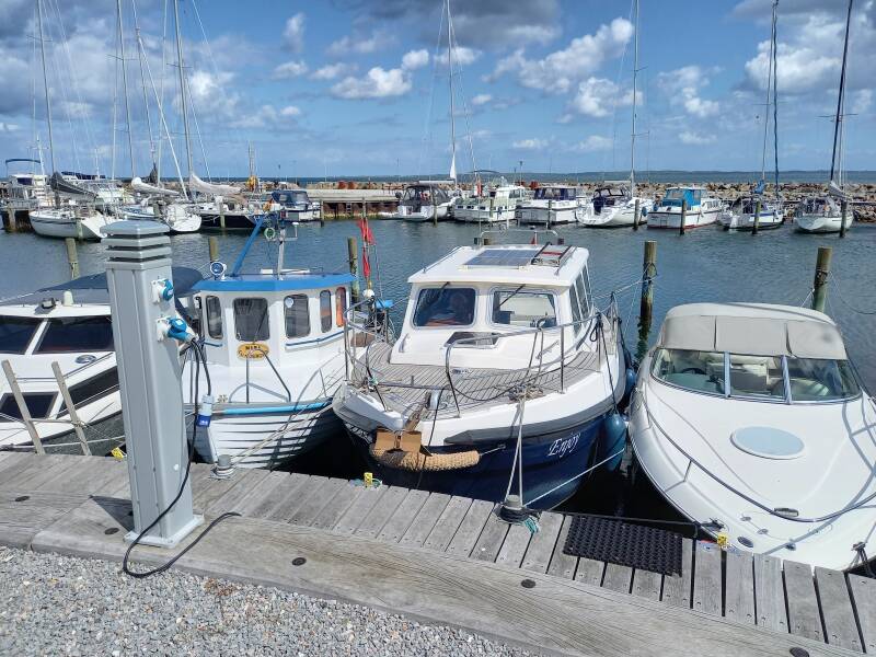 Vanmorgen om 08.00 uur zijn wij vertrokken uit Marstal. Hier nog even getankt. Met de wind in de rug ging het voorspoedig. Onder de brug bij Rudkoebing hadden we 3 km stroom tegen. Hier stonden behoorlijke golven maar doordat we de wind in de rug hadden hadden we hiervan geen last. Bij de vuurtoren van Elsehoved kregen we een kortstondige regenbui en daarna kwam de zon weer tevoorschijn. Aangemeerd in de haven van Lundeborg. In deze haven waren we in het verleden al 2x geweest. We kregen een welkom van onze Deense buur boot in de haven.