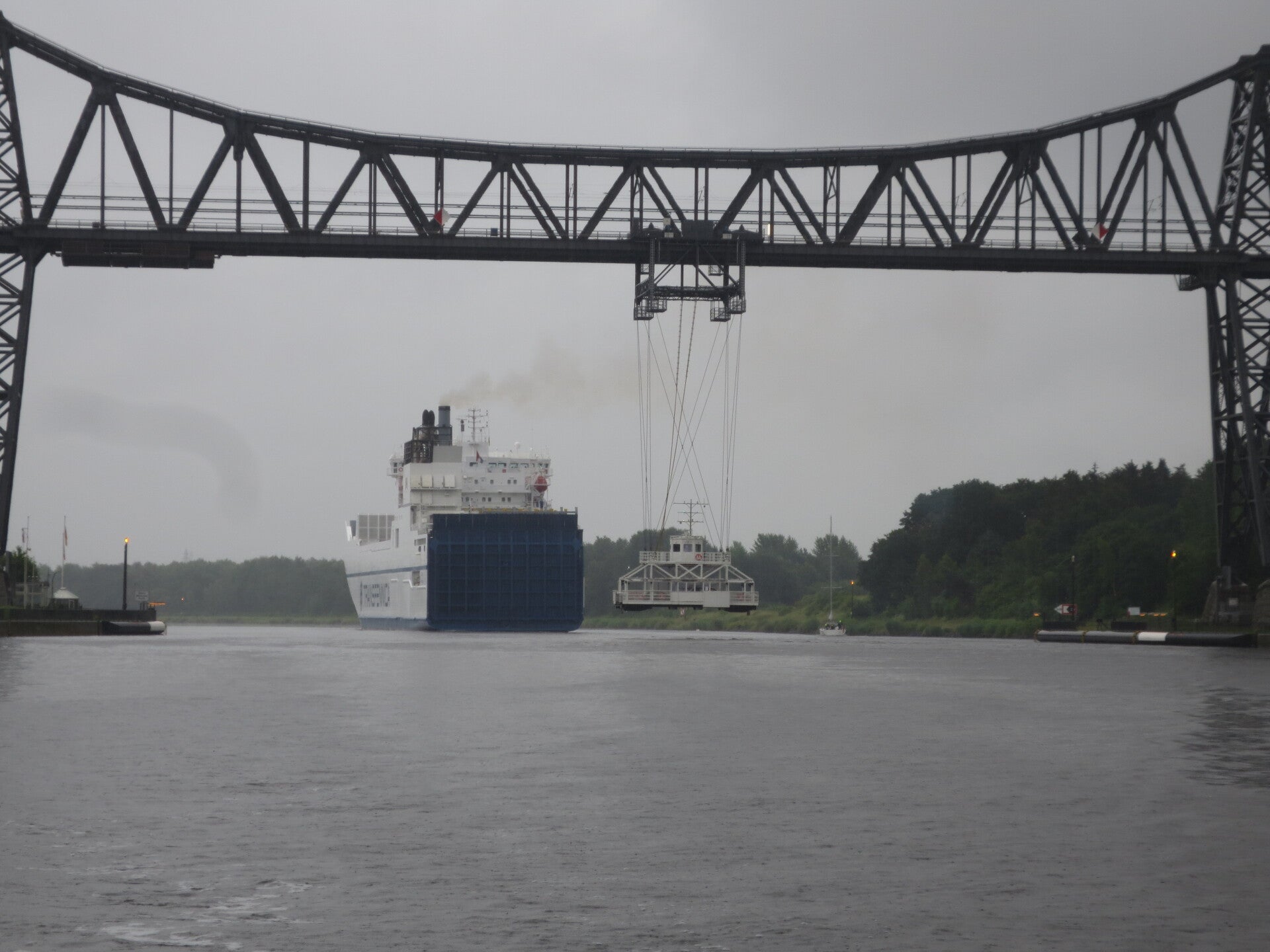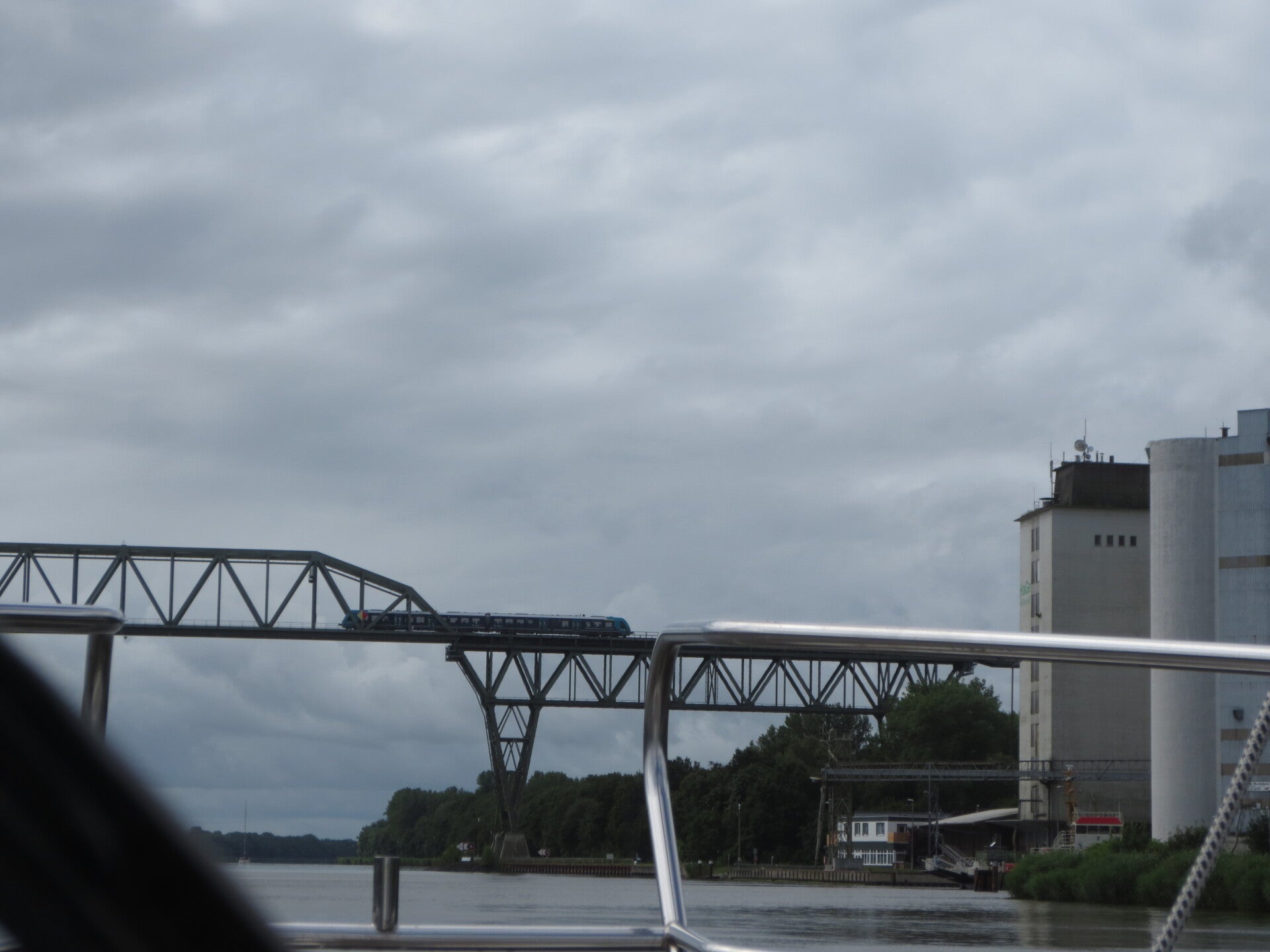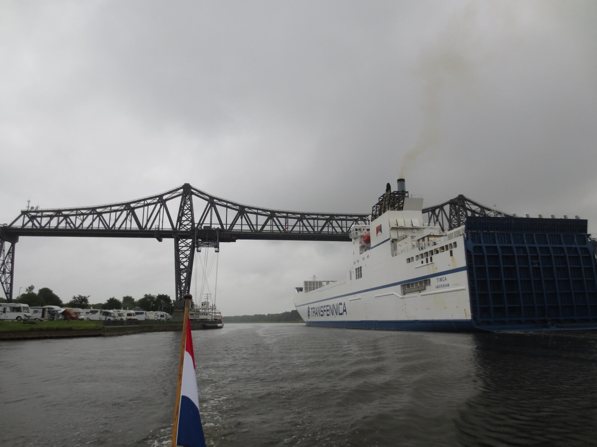 Wij zijn om 07.30 uur vertrokken vanuit Flemhuder See en naar een afmeerplek bij de Gieselaukanal sluis naar de Eider . Onderweg hebben we veel regen gehad. In Rendsburg nog een paar mooie foto’s kunnen maken van de hangende pont onderaan de spoorbrug. De hangende pont ging tussen 2 grote schepen naar de overkant.