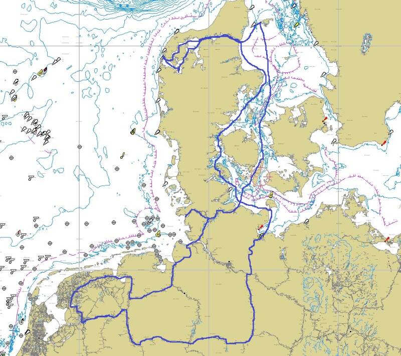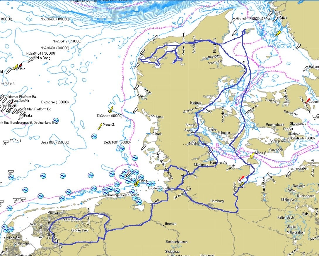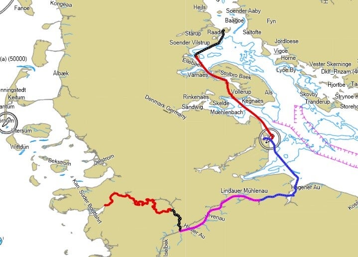 - Bij Travemünde de Oostzee op en onder het eiland Fehmarn langs de Duitse en Deense oostkust naar het noorden.