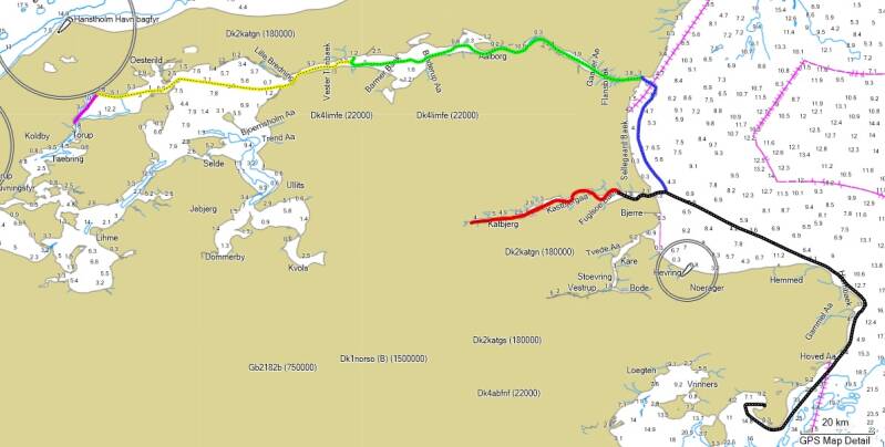 - Langs de Oostkust van Denemarken naar boven via Sønderborg, Middelfart, Grenaa en bij Hals de Limfjorden in