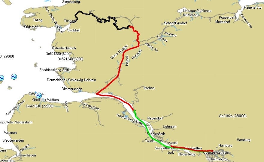 - Door de nieuwe sluis (die geopend wordt in April 2022) de Elbe op tot de sluis bij Brunsbüttel