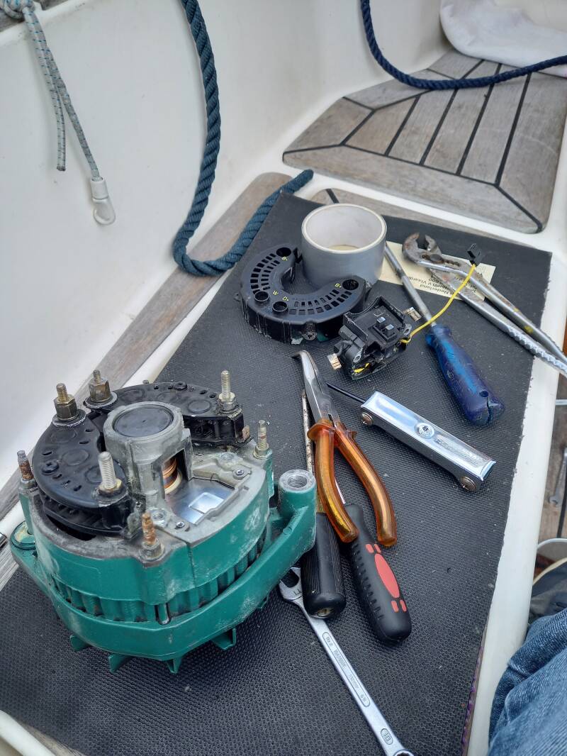 Vertrokken om 6.30 vanuit het zandgat in Gorssel en verder de IJssel op gevaren naar Giesbeek. Het was in de vroege ochtend hier en daar nog wat nevelig. Met de AIS ontvanger was het duidelijk te zien waar de grote schepen zaten. Onderweg hadden we af en toe dynamo storingen waarbij ook de accu spanning wat inzakte. Geen probleem van deze storingen ondervonden omdat de zonnepanelen het goed konden bijhouden. Op onze ligplaats de dynamo gedemonteerd en het inwendige bekeken. Koolborstels waren ok maar het schuifstekkertje naar een van de koolborstels was zwaar gecorrodeerd. Deze had een overgang weerstand. Stekkertje schoon geschuurd en ingesmeerd met watervast vet. Het geheel gemonteerd en de dynamo weer op de motor geplaatst. Alles werkte weer ok.