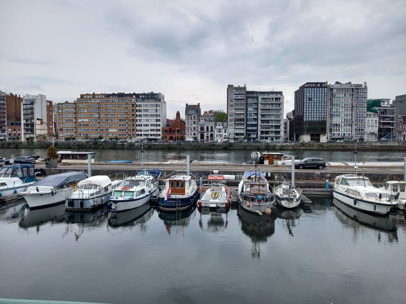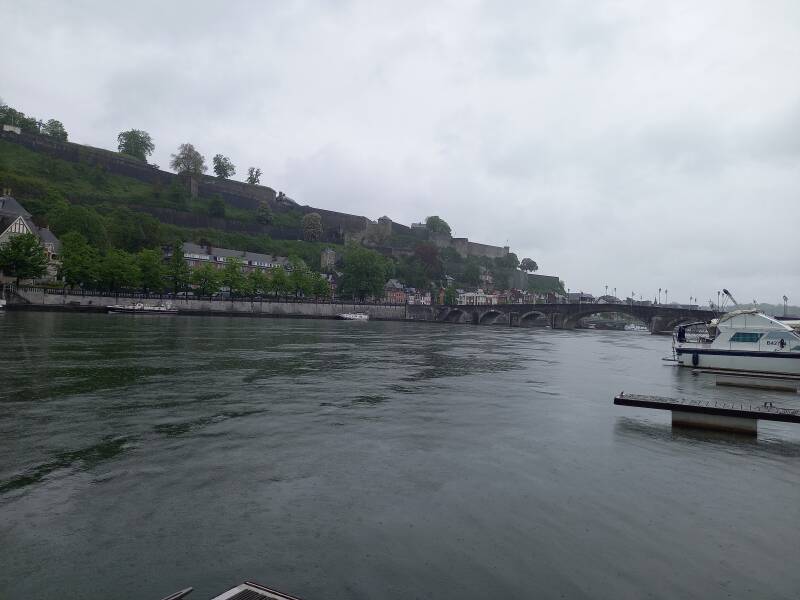 Vanochtend om 07.30 uur vertrokken. Om 09.45 uur gingen we alleen door sluis Andenne-Seilles 5,25 meter omhoog. Het begon steeds harder te regenen. Om 11.45 uur waren we bij sluis Grand-Malades. We gingen 3,9 meter omhoog samen met een vrachtschip en een motorboot om 12.30 uur. We meerden aan in de haven van Namen aan BB kant om 12.45 uur. Even later meerden meerdere boten aan die we ook zagen in de jachthaven van Hoei. Door de regen brak er schuin tegenover ons een dikke tak van een boom af.