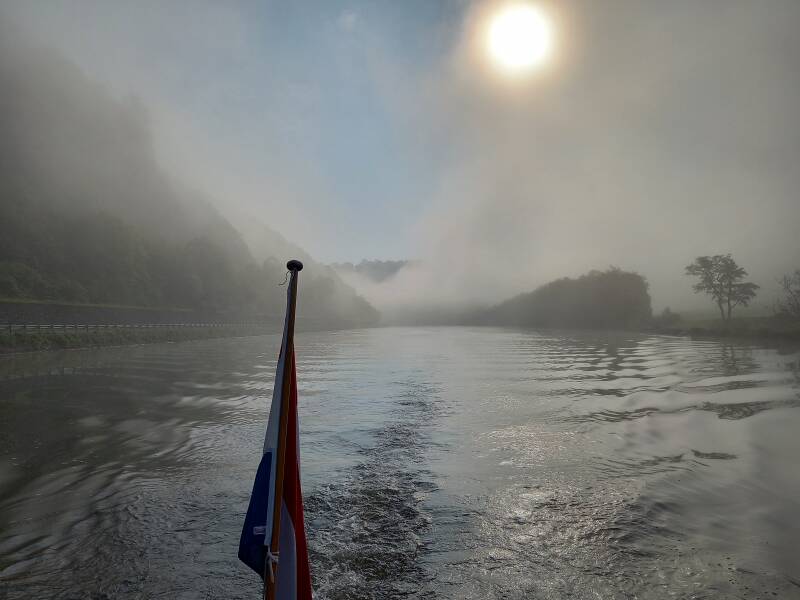 Vanmorgen om 06.00 uur opgestaan en toen we naar buiten keken was er dikke mist. Toen de mist optrok zijn we om 07.30 uur vertrokken. Bij de eerste sluis Anseremme vroeg de sluiswachter of we doorgingen naar Frankrijk. Ons antwoord was OUI. Na de sluis kregen we weer dikke mist. Gelukkig konden we op de digitale kaart goed zien waar we voeren. Bij Chateau de Freyr trok de mist weer weg. Op de Maas was de stroming toegenomen er stond iets meer dan 3 km.