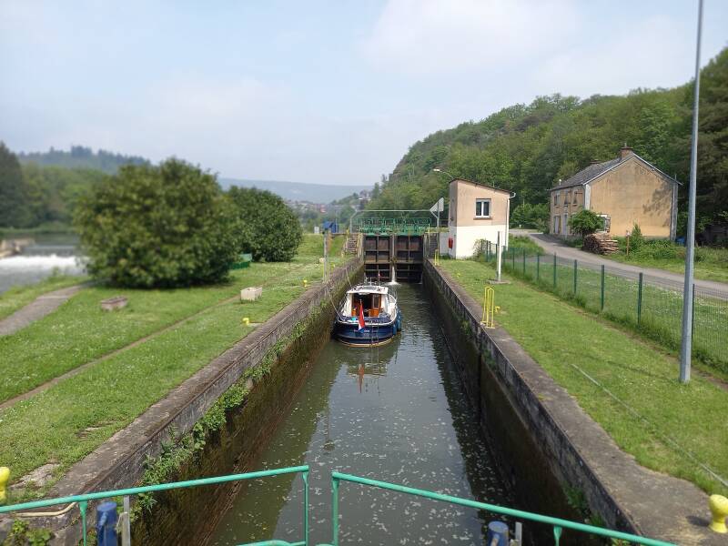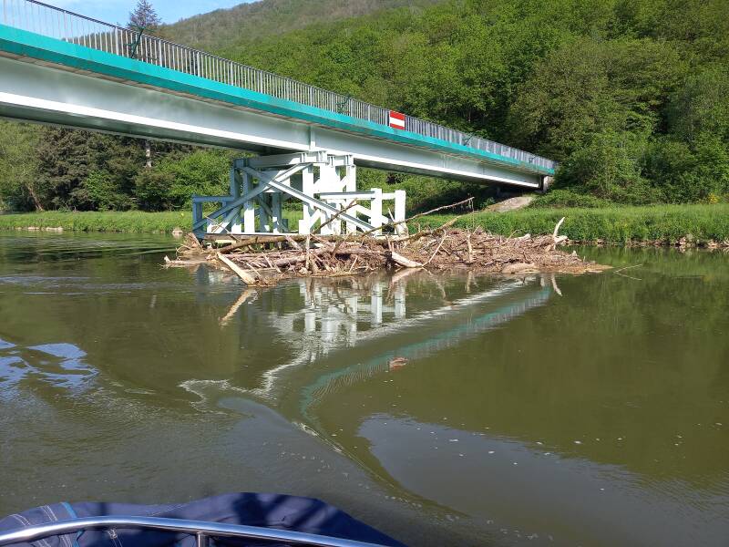 Vanmorgen eerst naar de warme bakker, die al om 06.00 uur op zondag openging, croissants en een stokbrood gekocht. Om 08.45 uur vertrokken naar onze eerste sluis. De sluizen draaien van 09.00 uur tot 18.00 uur. Vandaag totaal 6 sluizen gehad en hiermee 16,4 meter omhoog gegaan. Bij de eerste sluis was iemand van de VNF alle drijfhout aan het verwijderen achter de deur. Bij 2 sluizen moesten we bellen doordat ze in storing gingen. De monteur was snel ter plekke met zijn service auto. We kregen ook een andere afstandbediening. die van ons zou niet goed werken volgens de monteur. Bij 1 sluis werd de storing veroorzaakt doordat er drijfhout achter de deur zat en bij een ander sluis moest het hydraulische systeem ontlucht worden. We hadden op advies van een Kent boten clubgenoot M.N. het telefoon nummer van de VNF gelijk bij de grens al in de telefoon gezet. Onderweg heel veel IJsvogels gezien. Ook moesten we onderweg veel uitwijken voor drijvende boomstammen. De Maas stroomde hard vandaag. Op sommige stukken was onze snelheid maar 4 km/uur. Na een klein tunneltje aangemeerd in een mooie haven van Revin.