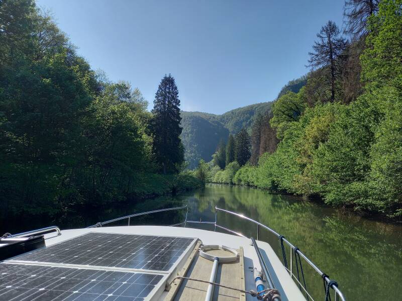 Vanmorgen om 08.45 uur vertrokken en door 5 sluizen als enigste gegaan zonder problemen totaal 12,65 meter omhoog. Er waren 2 sluizen bij dat leken wel champagne flessen waarvan de kurk werd afgetrokken. Bij deze 2 sluizen ging het instromen van het water wel heel hard. We waren zo boven. De Maas stroomde nog behoorlijk. Onze snelheid lag rond de 6 km/uur. Ook vandaag moesten we vaak uitwijken voor bomen en takken. We hebben 31 km rivier afgelegd maar met een rechtstreekse afstand van 14 km omdat de rivier meandert. Het was een mooie route tussen beboste hellingen en rotsen. We zijn als enigste aangemeerd in Joigny Sur Meuse met een mooie aanlegsteiger.