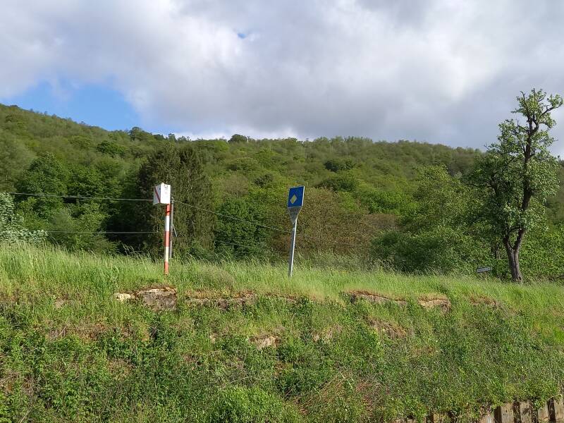 Vanmorgen om 10.00 uur vertrokken en we hebben 4 sluizen gehad. De bedoeling was om aan te meren in Nassau maar door de lage waterstand zag de rotsachtige schuine kant er niet erg uitnodigend uit. Doorgevaren naar Dausenau en aangemeerd aan een gastensteigertje onder de stadsmuur uit de middeleeuwen. Onderweg nog 2 aangemeerde boten gezien die bij ons in Verdun aan de steiger lagen.