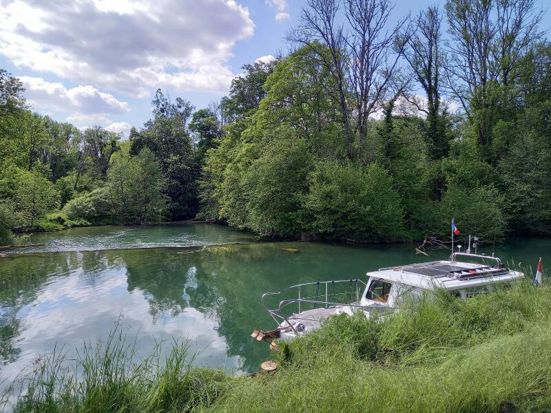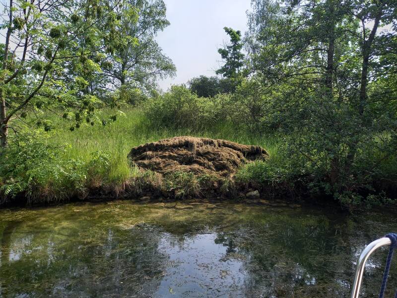 Vanmorgen om 08.15 uur vertrokken. Eerst boodschappen gedaan in de Kaufmarkt. Onderweg zagen wij door de verrekijker een drijvende speedboot met 2 heren onder de motorkap. Ik had het vermoeden dat ze pech hadden. Toen we dichterbij kwamen begonnen ze te zwaaien. De drijflijn weer tevoorschijn gehaald en de boot op sleep genomen. Afgezet bij een haventje achterin de oude rivierarm Fluener-Altrhein. Anker om 11.45 uur laten zaken in deze oude rivierarm. Deze plek staat in ons boek beschreven als een mooie ankerplek. Op deze plek ook 2 bevers gespot.