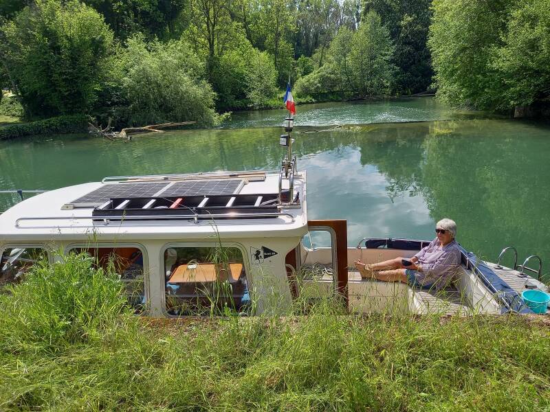 De boten Sirius en de SeaYou2 vertrokken om 09.30 uur. Kaye is nog even naar de bakker geweest. Wij vertrokken om 10.15 uur en zijn door sluizen 26, 27 en 27b totaal 8,8 meter naar beneden. We waren alleen en onderweg hadden we nog een beweegbare brug. Om 11.00 uur waren we op de Moezel. Op de Moezel geen waterplanten meer Hoera Hoera! We kwamen bij sluis Fontenoy en daar waren de Sirius en de SeaYou2. Ze moesten 45 minuten wachten van de sluiswachter op ons. Daarna gingen we alle 3 door sluis Aingeray 7,3 meter omlaag. Hierna zijn wij afgeslagen naar een inham en het anker laten zakken bij Liverdun om 13.00 uur. Later zijn we verhuisd naar een steigertje. We hebben genoten van het zonnetje.