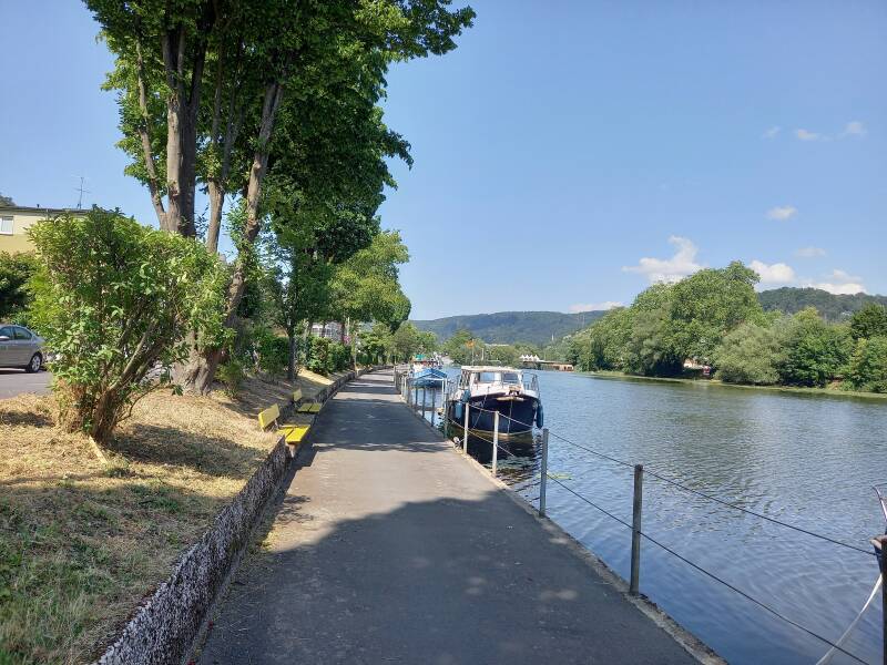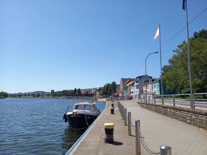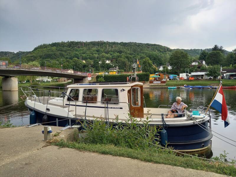 Om 10.30 uur vertrokken en een klein stukje naar Wasserbillig gevaren. Net toen we de lijnen vast hadden stopte er een auto naast de boot. Er stapte een jonge man uit met een baby. De man riep mij en vroeg in gebrekkig Engels of wij vandaag op de baby wilden passen. Dat kon volgens hem prima op de boot. Ik was best wel even stil van zijn vraag. Ons antwoord was gezamenlijk NEE dat gaan we niet doen. Daarna ging hij weer weg. Tja je gaat over allerlei dingen nadenken waarom hij de baby kwijt moest.