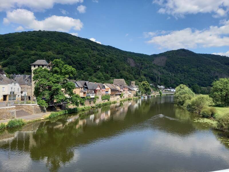 Om 08.10 uur vertrokken. Twee sluizen samen met een vrachtboot totaal 16,5 meter omlaag. We zijn aangemeerd in de jachthaven van Bernkastel-Kues. Hier staat een mooi kasteel op de berg net in een grote lus van de Moezel. Keurige jachthaven met een gezellige eettent. Een wandeling gemaakt in het stadje. Het stadje ligt wel een eindje van de jachthaven. Er is een Wandel/Fietspad van 1,5 meter breed voor beide richtingen naar het stadje. Op de 1,5 meter gaan Wandelaars, Fietsen, Elektrische fietsen, Scootmbiels en Steppen in beide richtingen. Dit is nog gevaarlijker dan lopen op een snelweg!! Gelukkig zijn we er zonder kleerscheuren afgekomen.