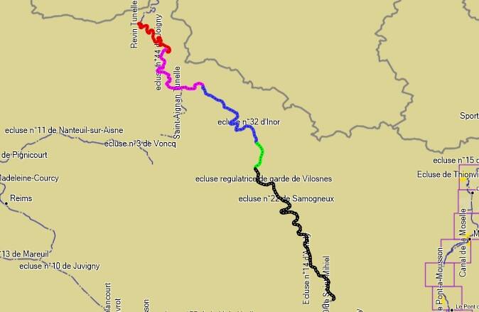 Bij de 2e sluis Waulsort waren we ook nog alleen. Onderweg was er nog een andere boot die los ging en met ons optrok. Bij sluis Hastiere waren we nu met 2 boten. Bij sluis 59 was de sluis van de grens Belgie-Frankrijk. Na het schutten konden we naar het kantoor om het vignet te kopen. Het vignet is nodig om te kunnen varen over de Franse waterwegen. Wij hebben een vignet van 30 dagen voor €112,89. Het enigste wat we nodig hadden was het ICP (Internationaal Certificaat voor Pleziervaartuigen). Uiterst vriendelijke ambtenaar. Tevens kregen we een afstandsbediening en uitleg voor de bediening van de sluizen. De eerste sluis no. 58 na de grens was bemand en met een haak werden onze lijnen door de sluiswachter om een bolder gelegd. Daarna gingen we de tunnel van Ham in (600 meter). De tunnel is onverlicht dus we hadden een schijnwerper op de plaats van het Geuzenvlaggetje gezet. Dit was onze eerste keer dat we door een tunnel gingen.