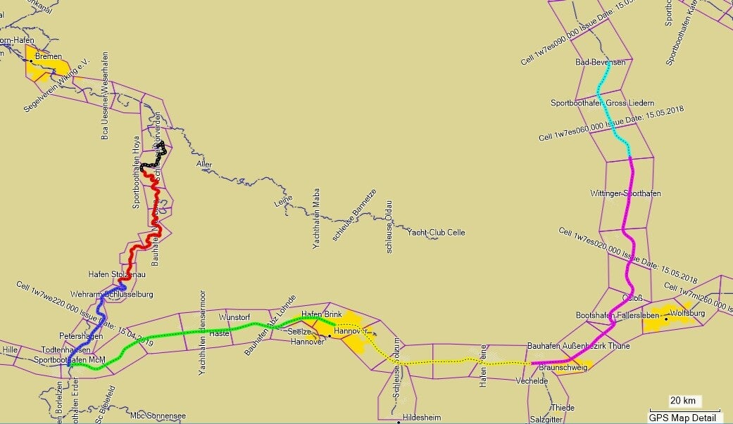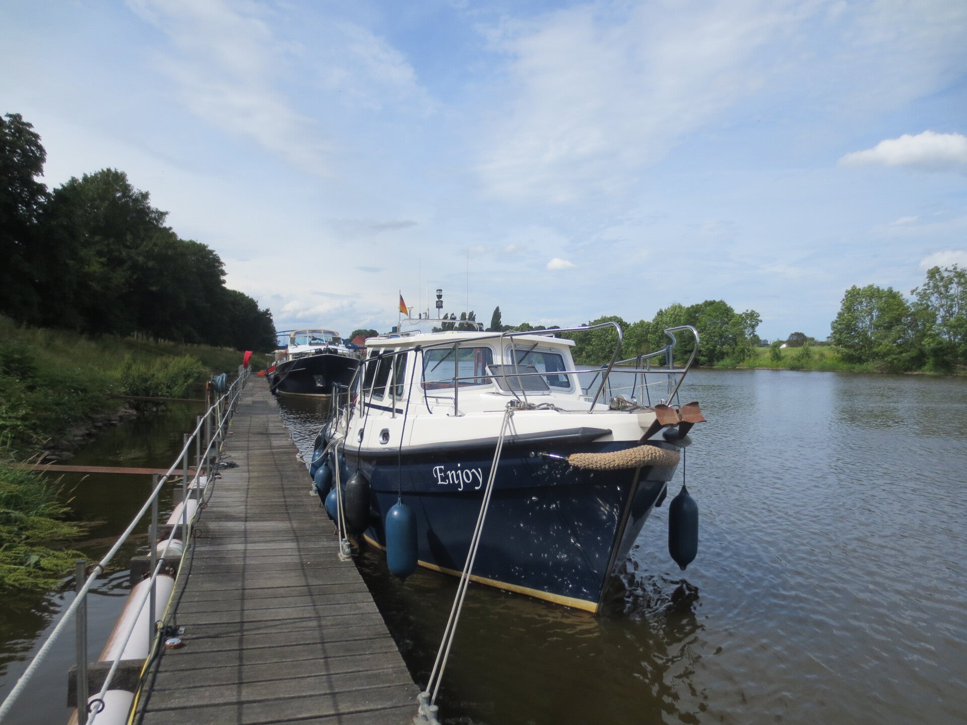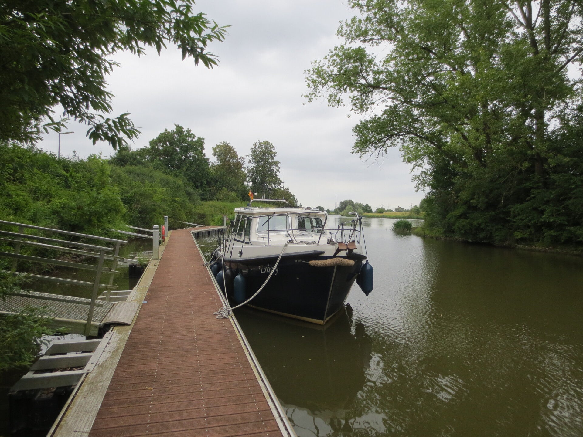 Eerst wat info over het Haren-Rütenbrock-Kanal proberen te vinden. Waterkaarten Live gebruikt gegevens van RWS. Hierop staat dat sluis 1 van het Haren-Rütenbrock-Kanal gestremd is vanaf 06-06-2024 tot nader bericht. Ik heb gebeld naar de RWS in Stadskanaal 0599-583711 en kreeg als antwoord dat het kanaal inderdaad gestremd is vanaf 06-06-2024 tot nader bericht. Een andere bootvaarder bij ons in de haven van Bremen heeft gebeld naar Nederlandse sluiswachter op 0623966716. Die vertelde dat het kanaal gewoon open is. Ook heeft een Duitser hier in de haven gebeld naar de Duitse haven in Haren en kreeg als antwoord dat het open is. Dus we gaan richting Haren. We vertrokken om 10.30 uur de Weser af zodat we bij Elsfleth de kentering van het getij kregen. Toen we door de keersluizen bij Elsfleth de Hunte op gingen sloten de 2e rij deuren door de verandering in stroomrichting . De timing was perfect. Even een half uurtje in Elsfleth aangemeerd om te wachten voor meer stroming op de Hunte. Helaas gingen we achter 2 vrachtschepen aan richting Oldenburg. Door hun schroefwerking moesten wij veel bijsturen. Aangemeerd in de jachthaven naast de sluis waar we op heenweg ook waren geweest.