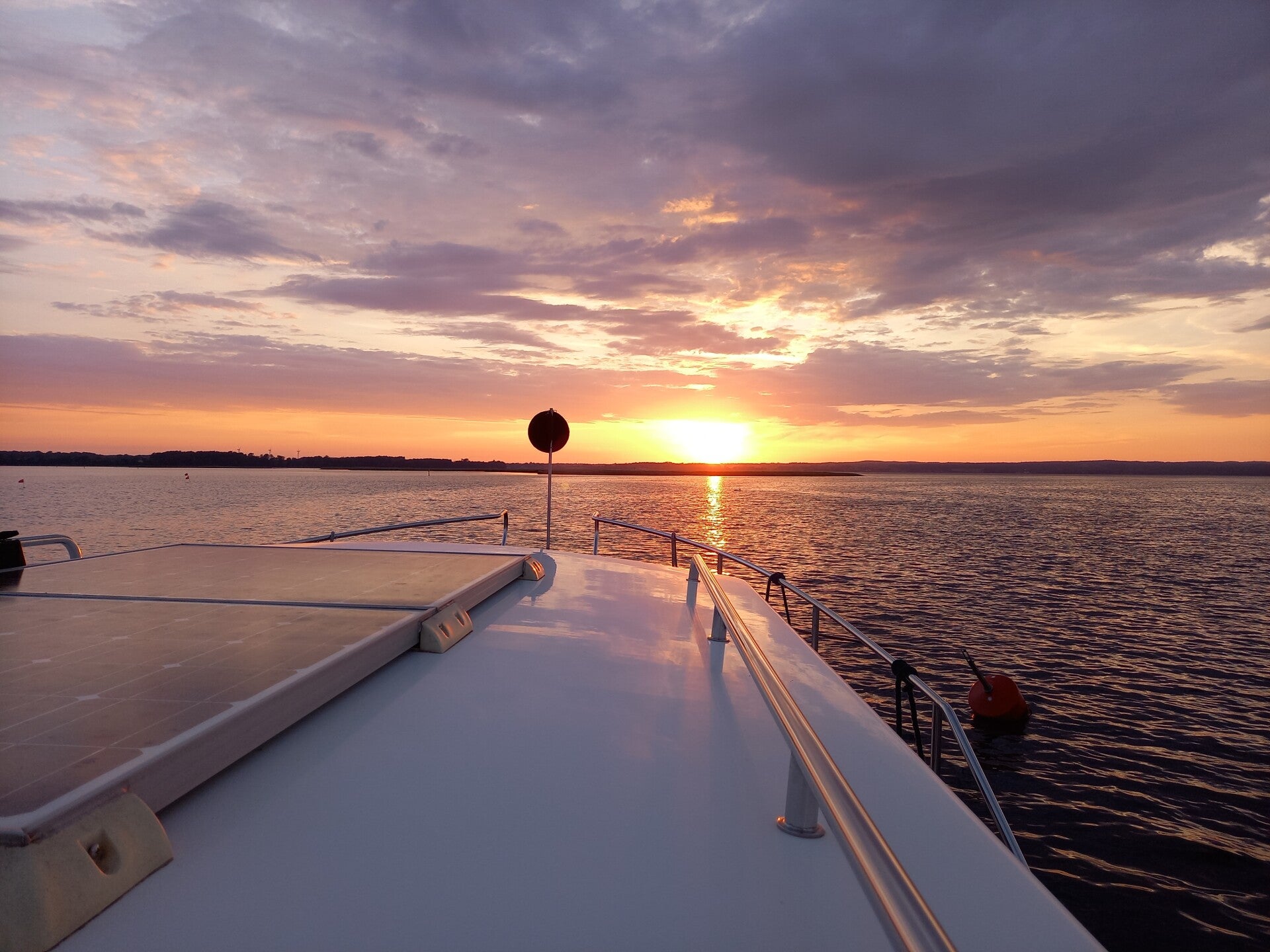 Om 04.30 uur met zonsopkomst opgestaan. Na de koffie en een broodje vertrokken. Van Marstal tot de zuidelijke punt van Langeland (20 km) hadden we de stroom mee maar wel lastige zijgolven. Eenmaal tussen Langeland en Fehmarn (50 km) kregen we golven schuin van achteren. Onderweg kregen we nog een bui waar veel wind in zat en dat kon je goed aan de golven merken. Deze golven hadden af en toe aardige schuimkoppen. Kaye zat overdwars in de achterste zithoek met een kussen in de rug en ik zat overdwars op de stuurstoel ook met een kussen in de rug en de voeten op de zit bank. Gelukkig hadden we alle losse spullen al opgeruimd. De stuurautomaat hield de boot netjes op koers. Eenmaal onder de brug door kwamen we aan hoger wal bij Grossenbroderfähre. Gevaren tot in de Grossenbroder Binnensee. Hier hebben we het anker laten zakken voor de middag met prachtig weer. Het anker hield het uiteindelijk niet zo goed door de vele waterplanten. In de avond zijn we naar jachthaven Wassersportzentrum Großenbrode gegaan. Hier zijn we vaker geweest.