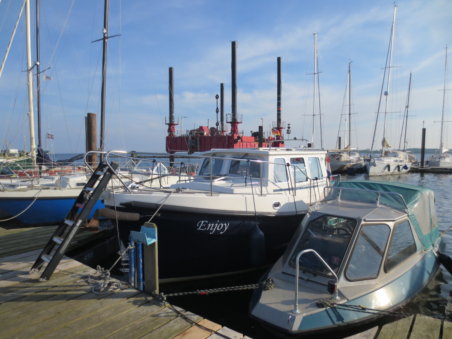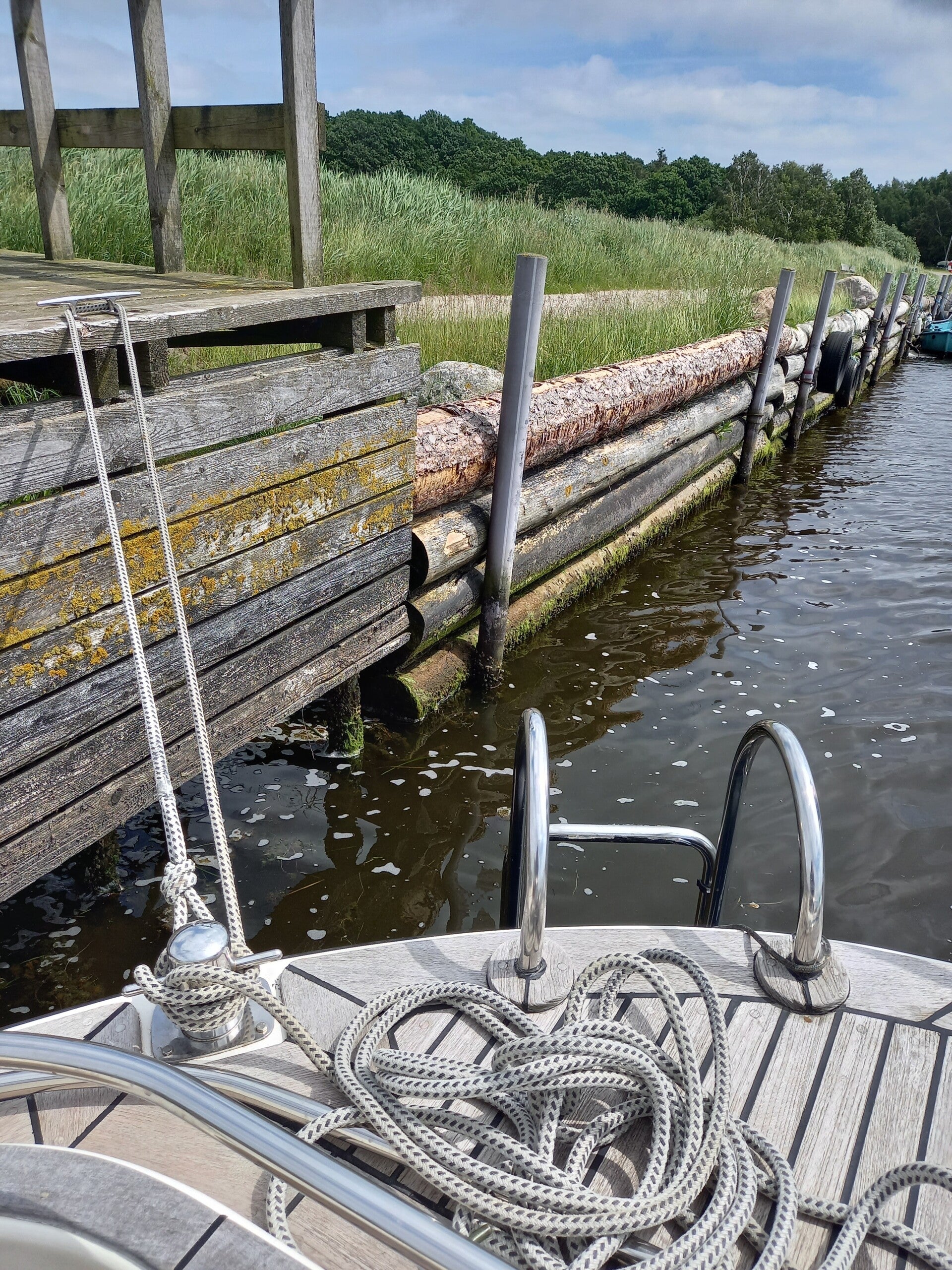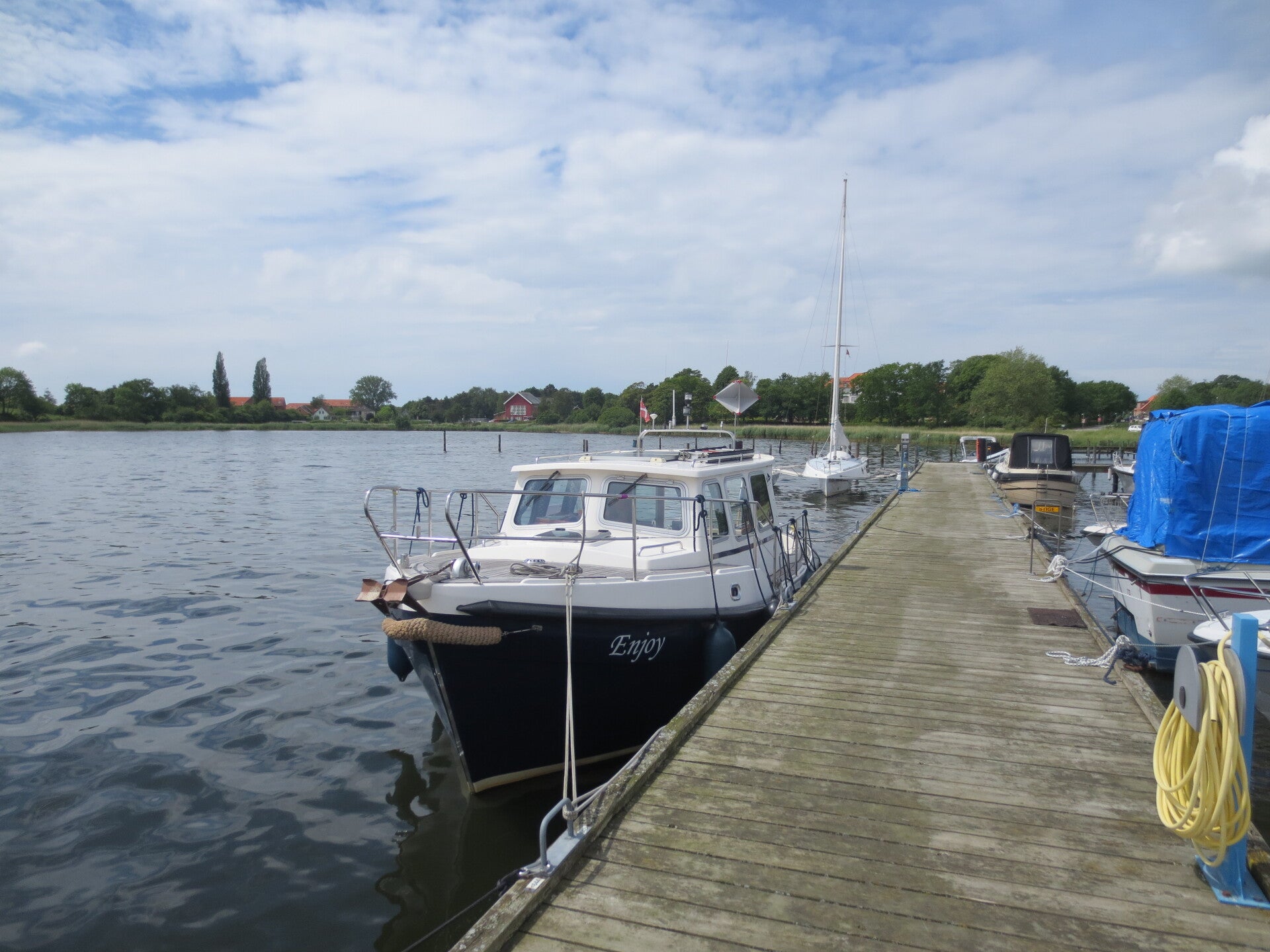 Vanmorgen uitgevaren naar een natuurhaventje Fed Havn in de Præstø Fjord. Volgens onze Deense buurman konden wij daar met de boot in. Diepgang haven ingang is 1 meter. In de haven is het 1,2 meter. Voor de ingang van deze haven zou wel wat blubber liggen. En inderdaad lag er een behoorlijke blubberlaag. We waren even bezig om hier door heen te komen. Terug was ook geen optie omdat we redelijke golven van achteren hadden. Eenmaal in de haven een plekje aan een redelijke steiger uitgezocht. De meeste aanlegplekken waren gemaakt van een beschoeiing van boomstammen. De bootjes die er lagen waren ook een stuk kleiner dan onze boot. Hierna de wandelschoenen aangetrokken en door de bossen naar het oude Fiskerhuset (vissershuisje) gelopen. Bij terugkomst gewacht tot het hoogwater was rond 19.00 uur en toen de haven uitgevaren. Hierbij toch weer even door wat blub gevaren. Volgens een windsurfer hadden we wat meer stuurboord moeten houden om de blubberlaag te ontwijken. De wind was aardig gaan liggen en een ankerboei in de buurt opgezocht voor de nacht. Dit hebben we gedaan om de volgende morgen op tijd te kunnen vertrekken in verband met het tij. Eb en vloed verschil is maar 10 cm maar het maakt het verschil op een ondiepte!!
