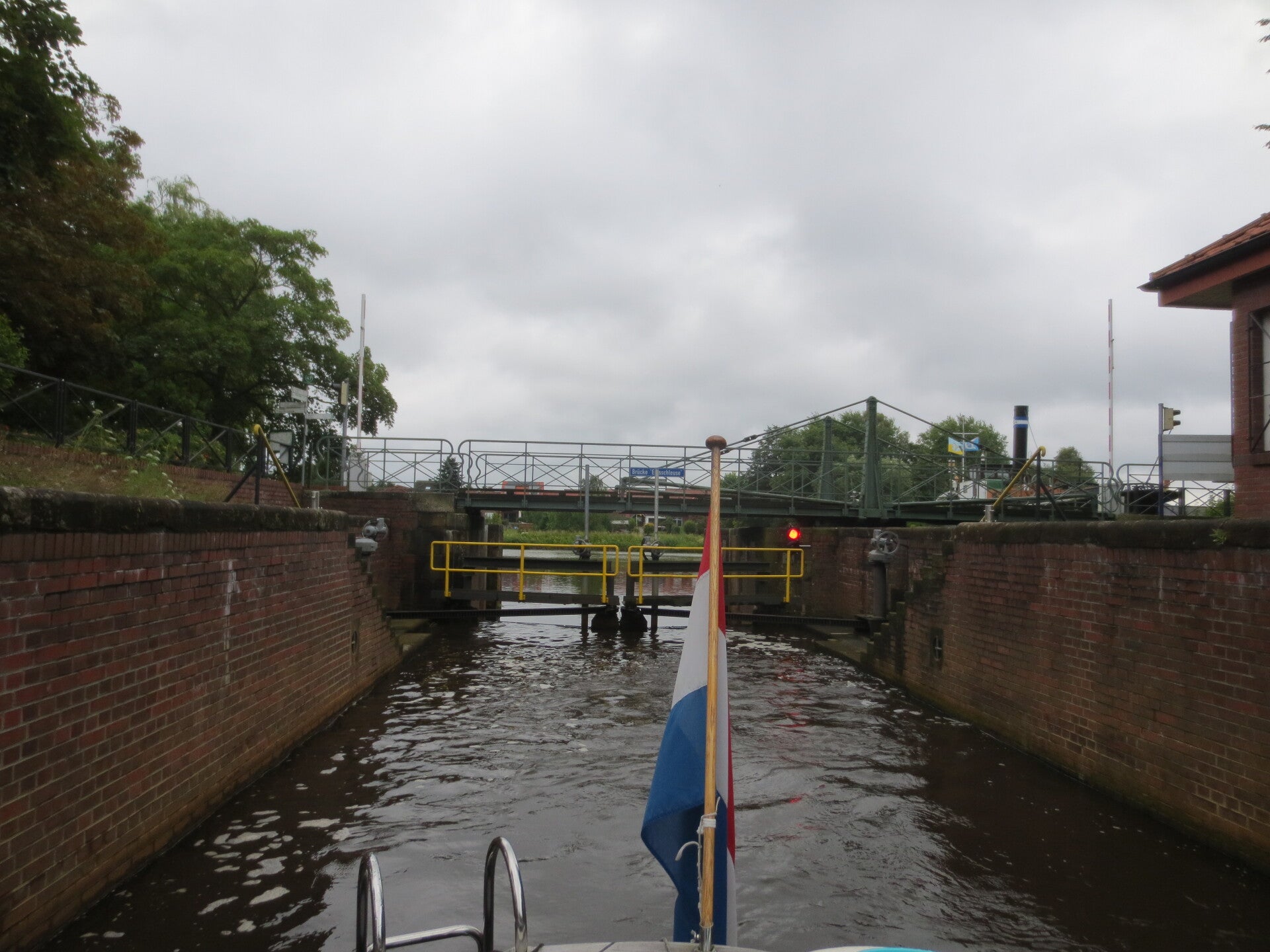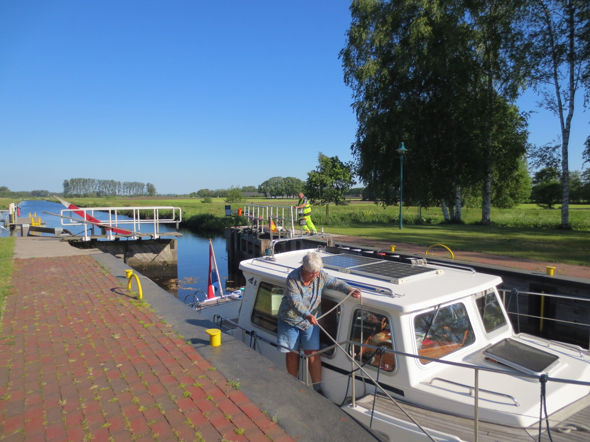 Omdat het in de ochtend nog mooi weer werd voorspeld en in de middag veel regen zijn we vroeg op pad gegaan. De sluis in Oldenburg zou om 06.00 uur draaien. Bij aankomst was deze in storing. Van de sluiswachter moesten wij Duits praten omdat hij ons niet verstond. Om 08.00 uur ging de sluis weer draaien maar voor ons duurde het tot 09.15 uur omdat er 3 grote vrachtschepen door heen gingen. Gelukkig gingen we met een Duits jacht door de sluis. We lieten hem het praten doen via de marifoon. De sluiswachter vertelde hem dat wij ons niet hadden aangemeld. Wij hebben maar niets gezegd en gewoon meegevaren. Het Duitse jacht ging naar Haren. We zijn samen door sluis Dorpen gevaren. Doordat het veel regende ook met hun doorgevaren op het Eemskanaal door sluis Duthe en Hilter. We lieten hun maar steeds het praten doen met de sluiswachters. In de laatste 2 sluizen en onderweg hadden heel veel stortregen met onweer. De emmer stond halfvol met water achter op het achterdek. Om 20.00 uur aangemeerd in jachthaven Haren die behoorlijk vol was met passanten. Al onze kleding en schoenen waren klets nat. De schoenen in motorruim gezet om te drogen. Eigenlijk hebben we de afgelopen 9 weken best wel goed weer gehad wel veel wind in Denemarken. Maar nu wordt het misschien anders.