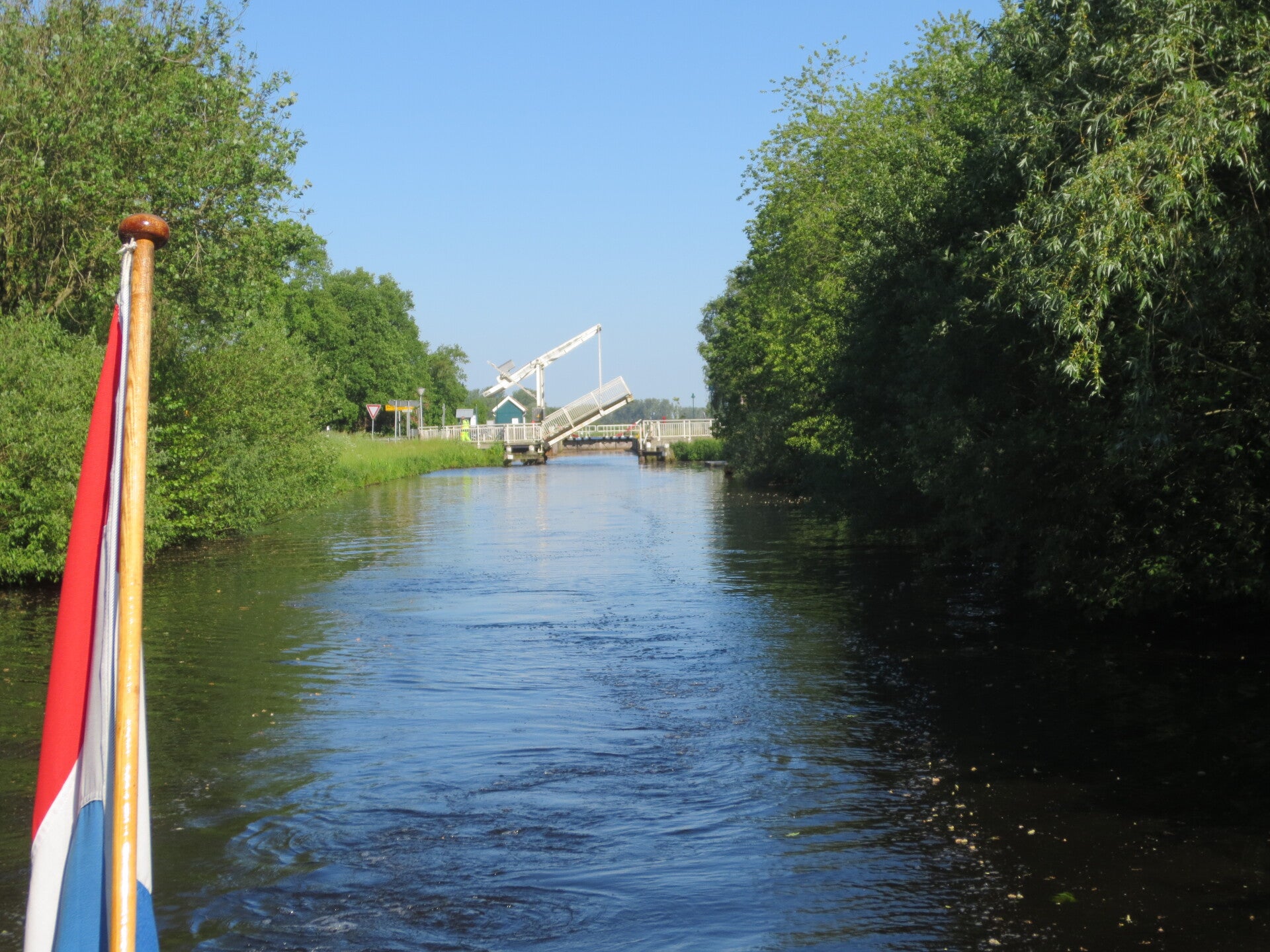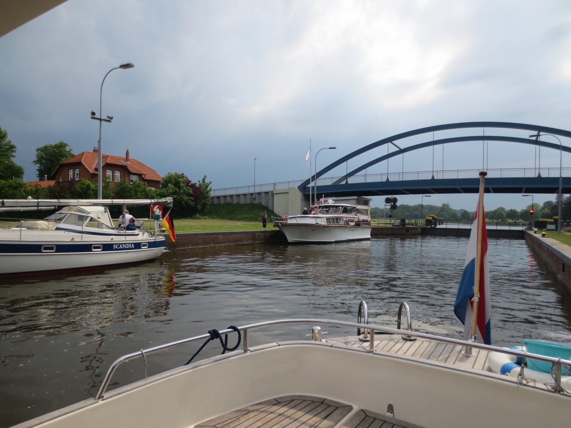 Eenmaal op de Eems werden de golven minder. Bij het stadje Leer zijn we afgeslagen de het riviertje de Leda opgevaren. Op de Leda hadden we nog 3 km stroom mee. Het is een mooie smalle rivier die meandert in het moeras landschap. Bij aankomst bij de Potshausen ophaalbrug werd het even spannend. De brug ligt in een bocht van de rivier en had geen doorvaart verlichting. Het bleek dat de brug open ging voor een boot van de andere kant die niet zichtbaar was. Hierdoor was het voor ons even manoeuvreren vanwege de stroom die we mee hadden. Achteraf blijkt dat deze brugbediening aangevraagd moet worden. Hierna het Elisabethfehnkanal opgevaren tot de eerste sluis. We hebben vastgemaakt aan een mooie aanleg steiger voor de sluis. Morgen vroeg gaan we bellen voor een doorgang.