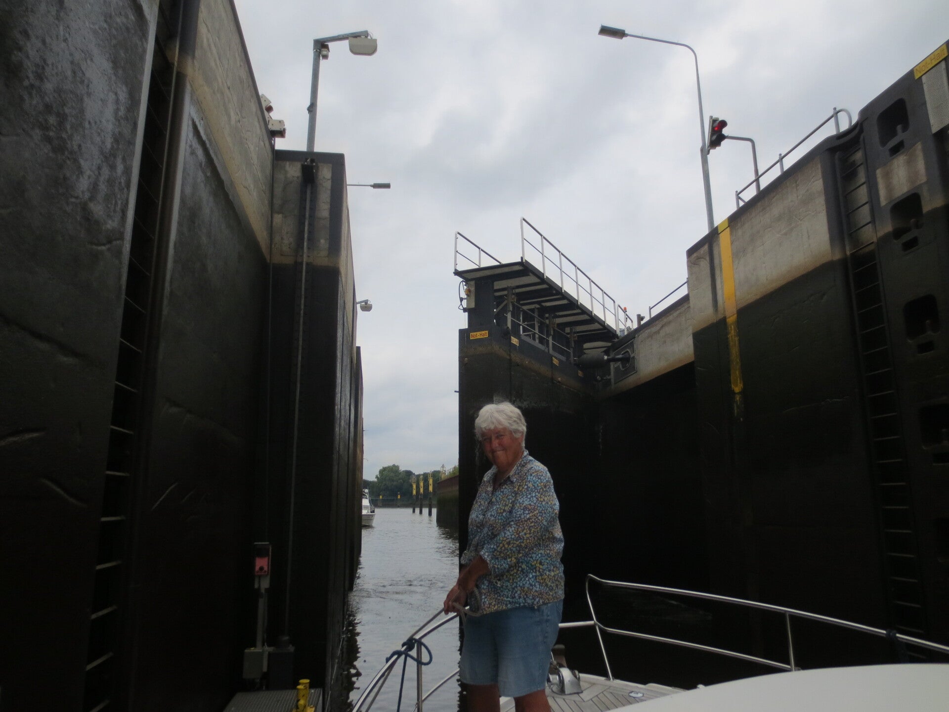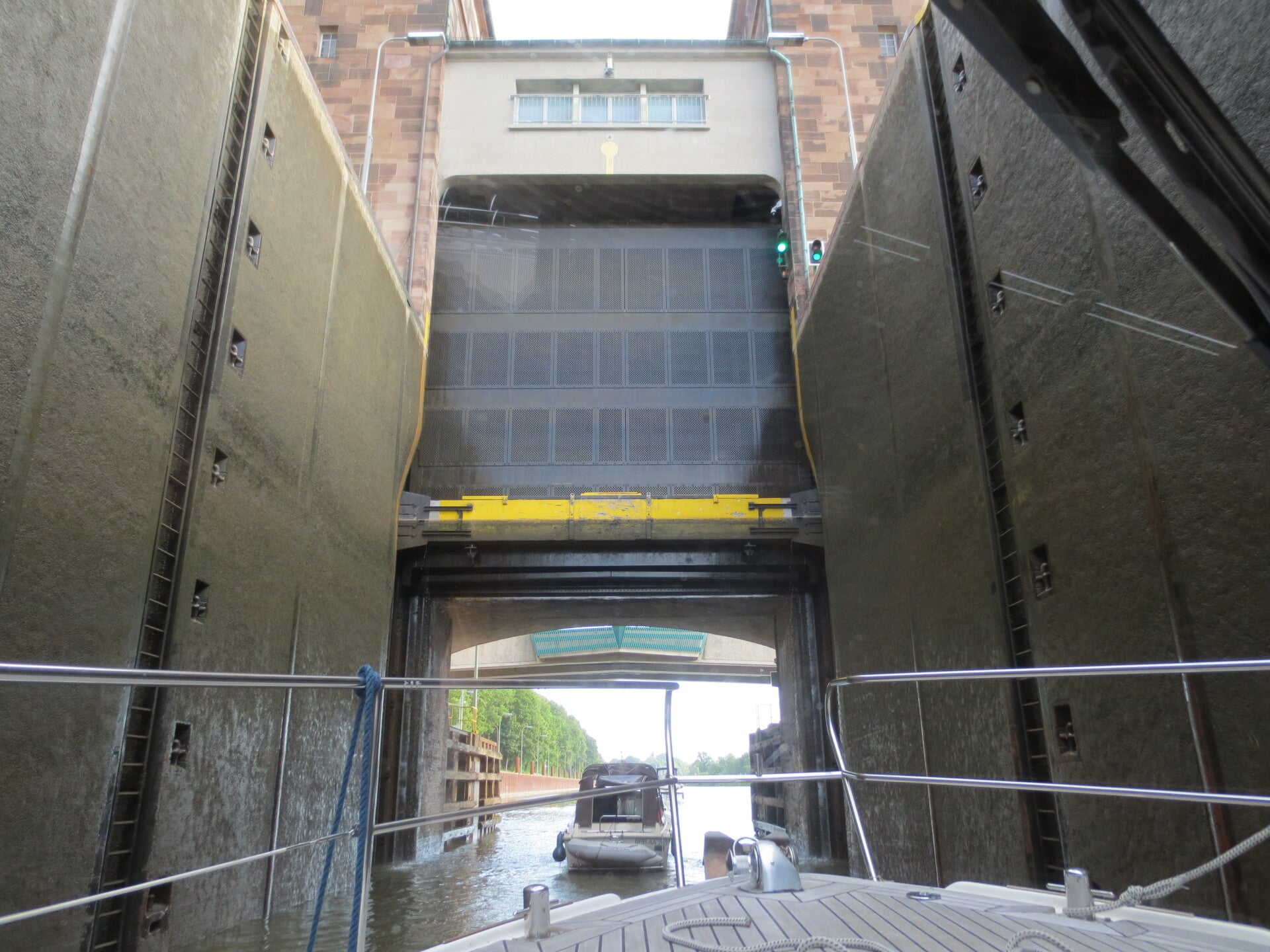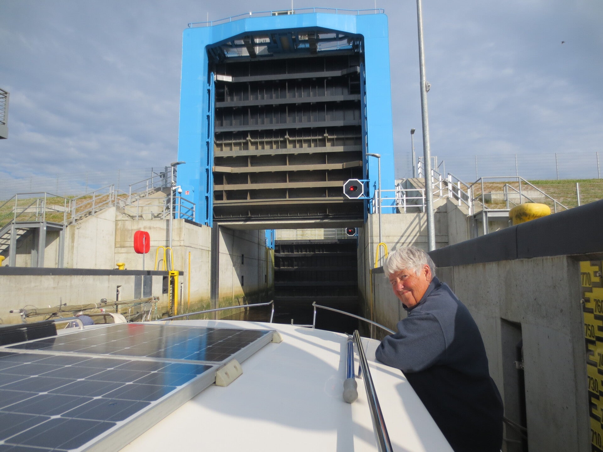 We konden niet door de sluis. Deze was gesloten. Volgens het infobord draait de sluis tussen 8.30 en 15.00 uur. We vroegen aan andere boten hoe de betaling moet voor de sluis. Niemand weet het. Een Duitser zei gewoon invaren dan horen we het wel of niet!