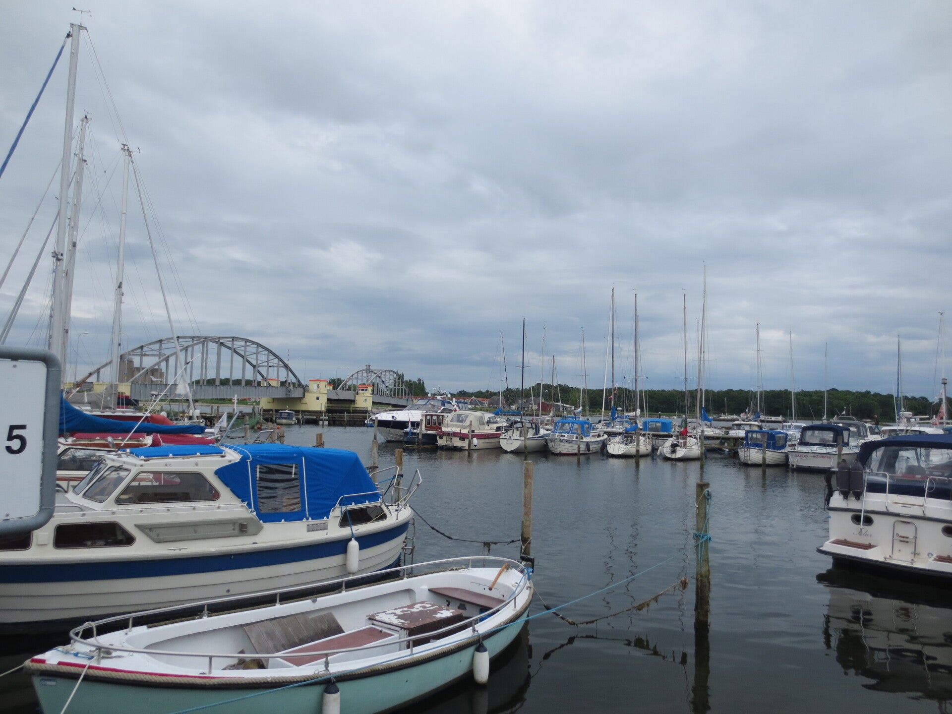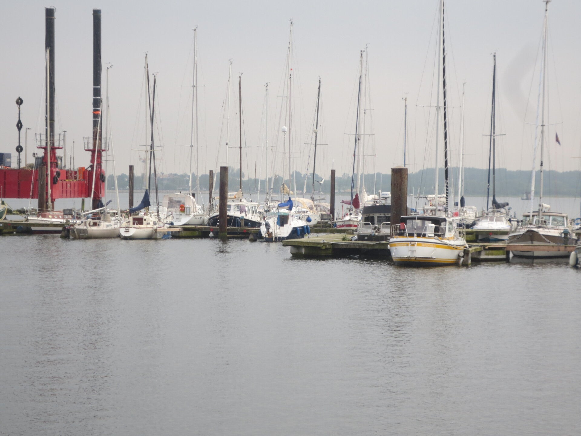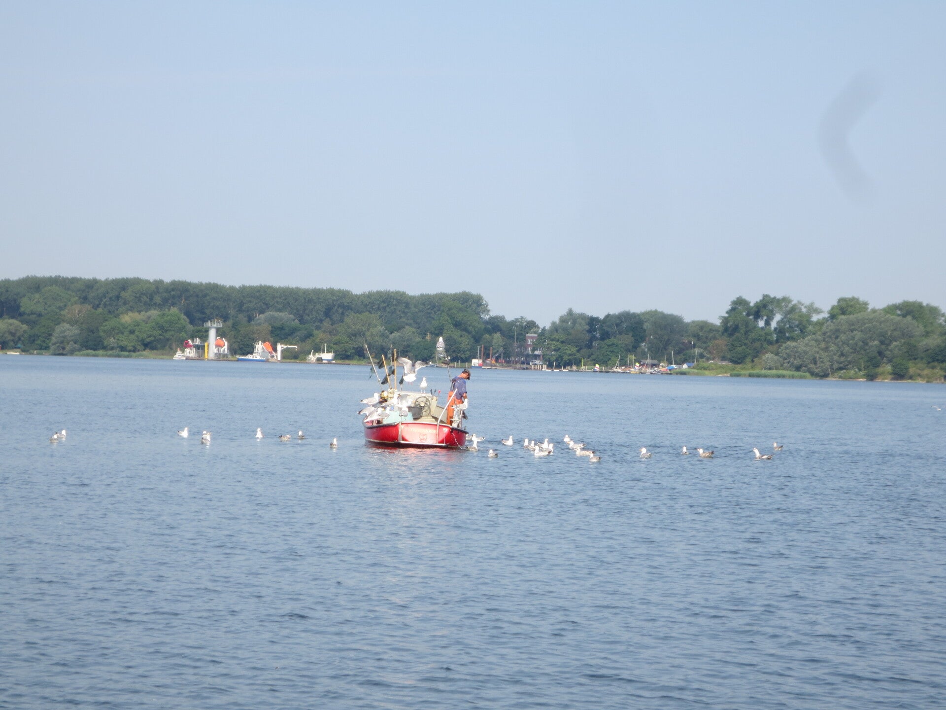 In de ochtend was er een vissersbootje die de paling netten leeg maakte. Ik als leek moet zeggen dat hij veel en grote paling had gevangen. De speciekuipen had hij snel vol. Lekker rondjes boot gezwommen en ook het logwieltje ontdaan van schelpjes. Om 13.30 uur zijn we vertrokken richting Lübeck omdat de weers vooruitzichten onweer voorspelden. Onderweg kwamen we een rondvaartboot tegen met Caroline van der Plas en haar boeren. Net voor Lübeck begon het hard te waaien. Toch nog droog kunnen aanmeren in “Lanchwehr Wasserfahrer Lübeck e.v”. Leuke haven met vriendelijke mensen.