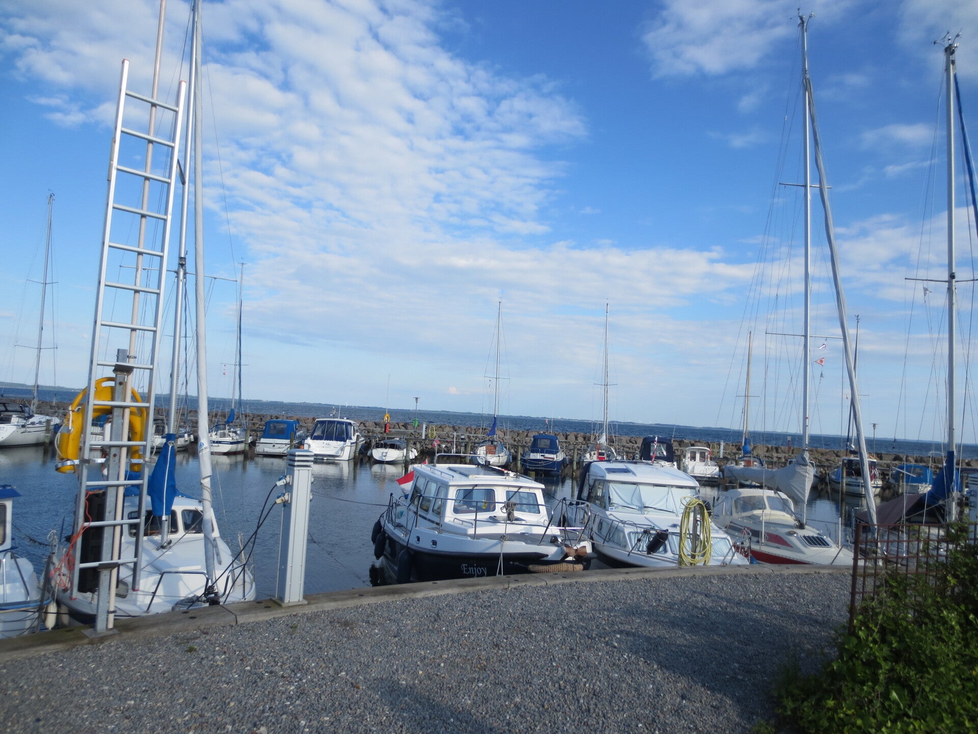Vanmorgen van het eiland Fejø naar Femø gevaren. Het was een knobbelig zeetje doordat de golven van 2 kanten kwamen om het eiland Femø heen. Gelukkig kregen we bij het aanmeren hulp. Je vaart tussen 2 palen door waar je de achterlijnen omheen doet en op de wal stonden geen bolders maar ringen. Dus je kunt je lijn er niet van een afstand erdoor halen. Na het aanmeren hebben we een flinke wandeling gemaakt. In de middag waren 2 mannen bezig met een hoogwerker om bij een zeilboot een rolfok te plaatsen. Op dat moment kwam er een gemene bui aan met zeer veel wind waardoor ze de werkzaamheden moesten staken.