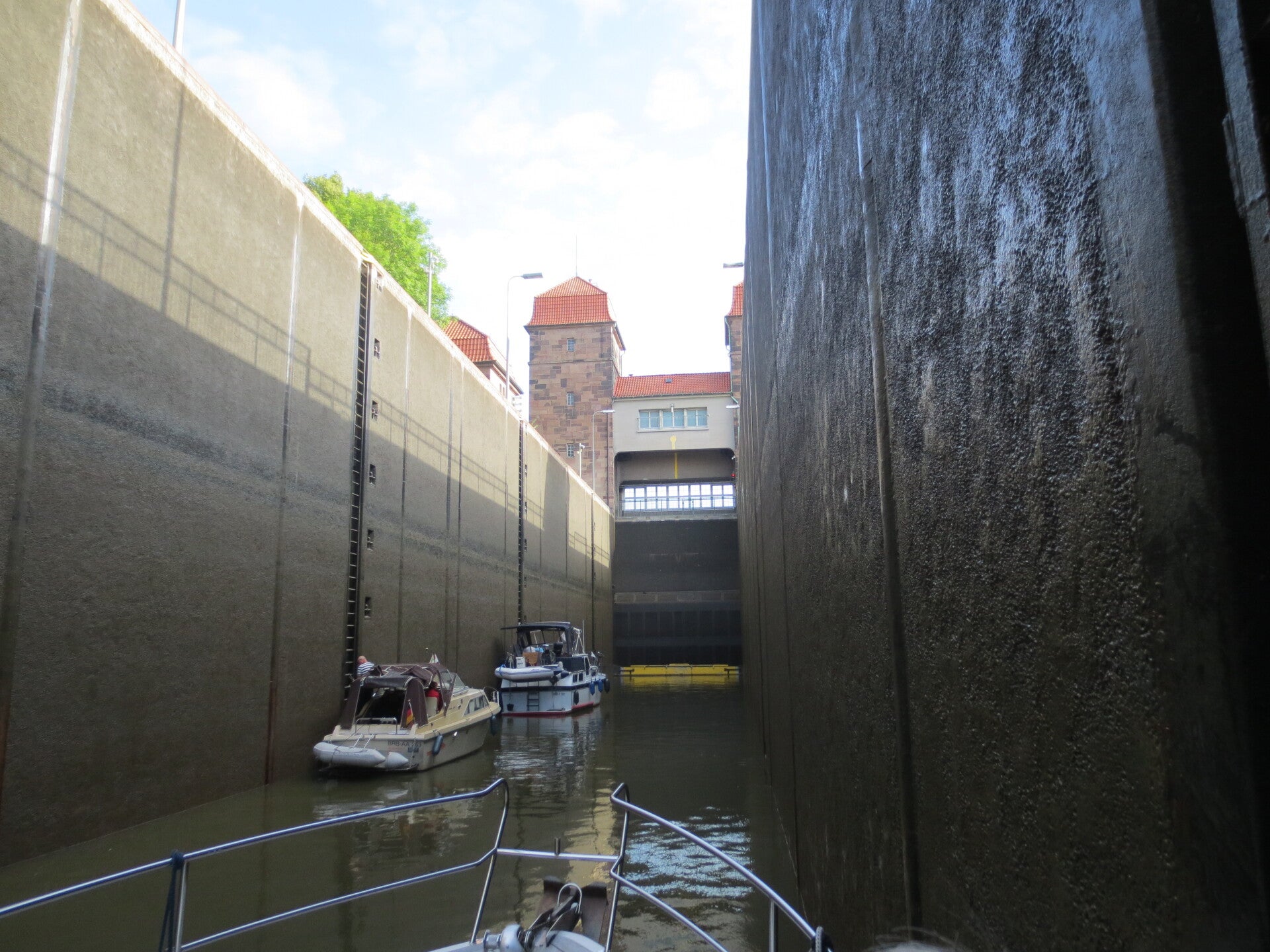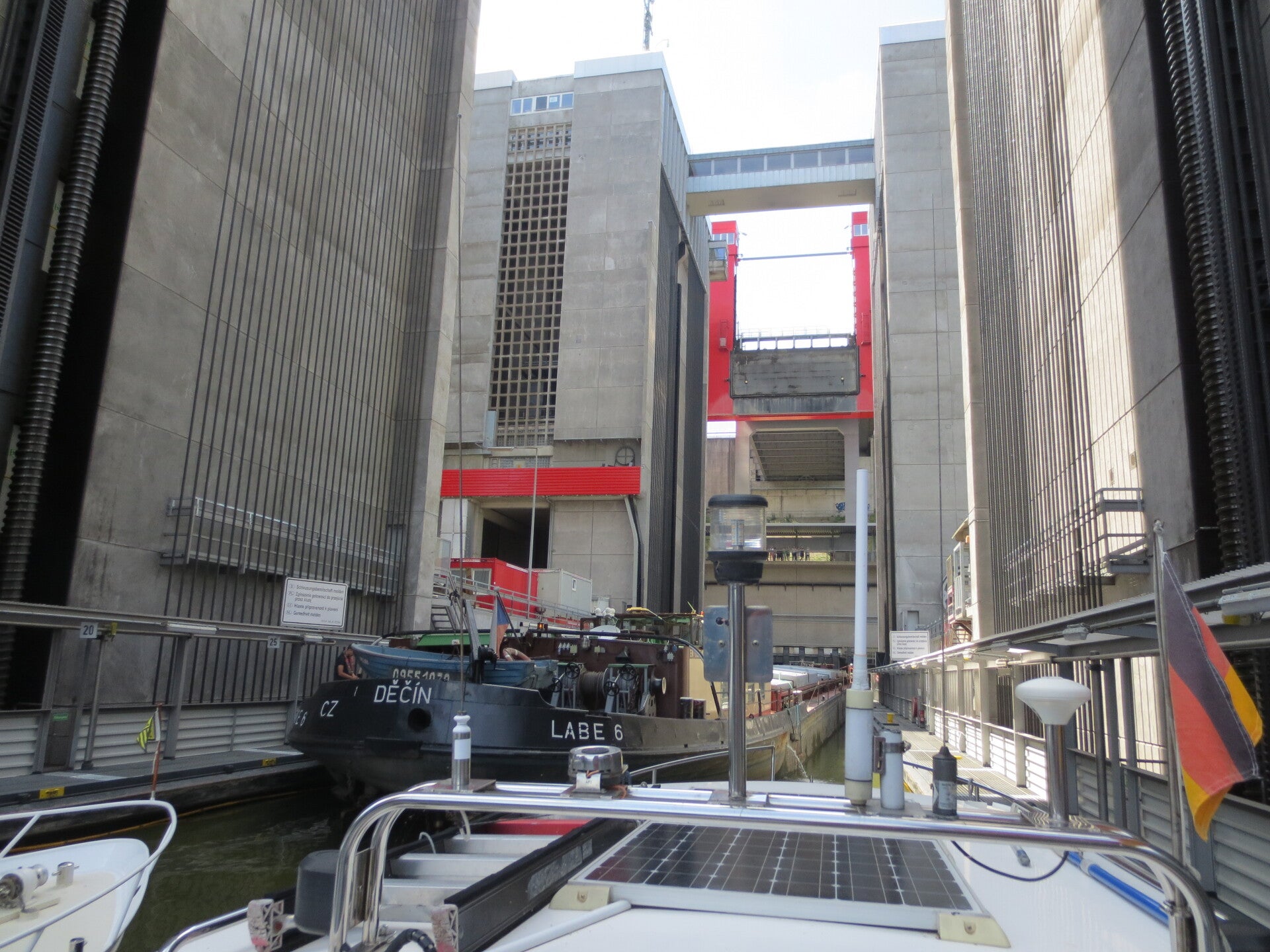 Vanmorgen om 10.15 uur vertrokken met Laag Water. Eerst hadden we nog wat stroom tegen. Het was rustig op het water. Bij sluis Geesthacht moesten we even wachten. Twee grote binnenvaartschepen en wij met nog een jachtje werden geschut. Na de sluis hadden we 3 km stroom tegen op de Elbe. Tot net na de sluis gevaren in Lauenburg. Het jachthaventje voor de sluis was vol.