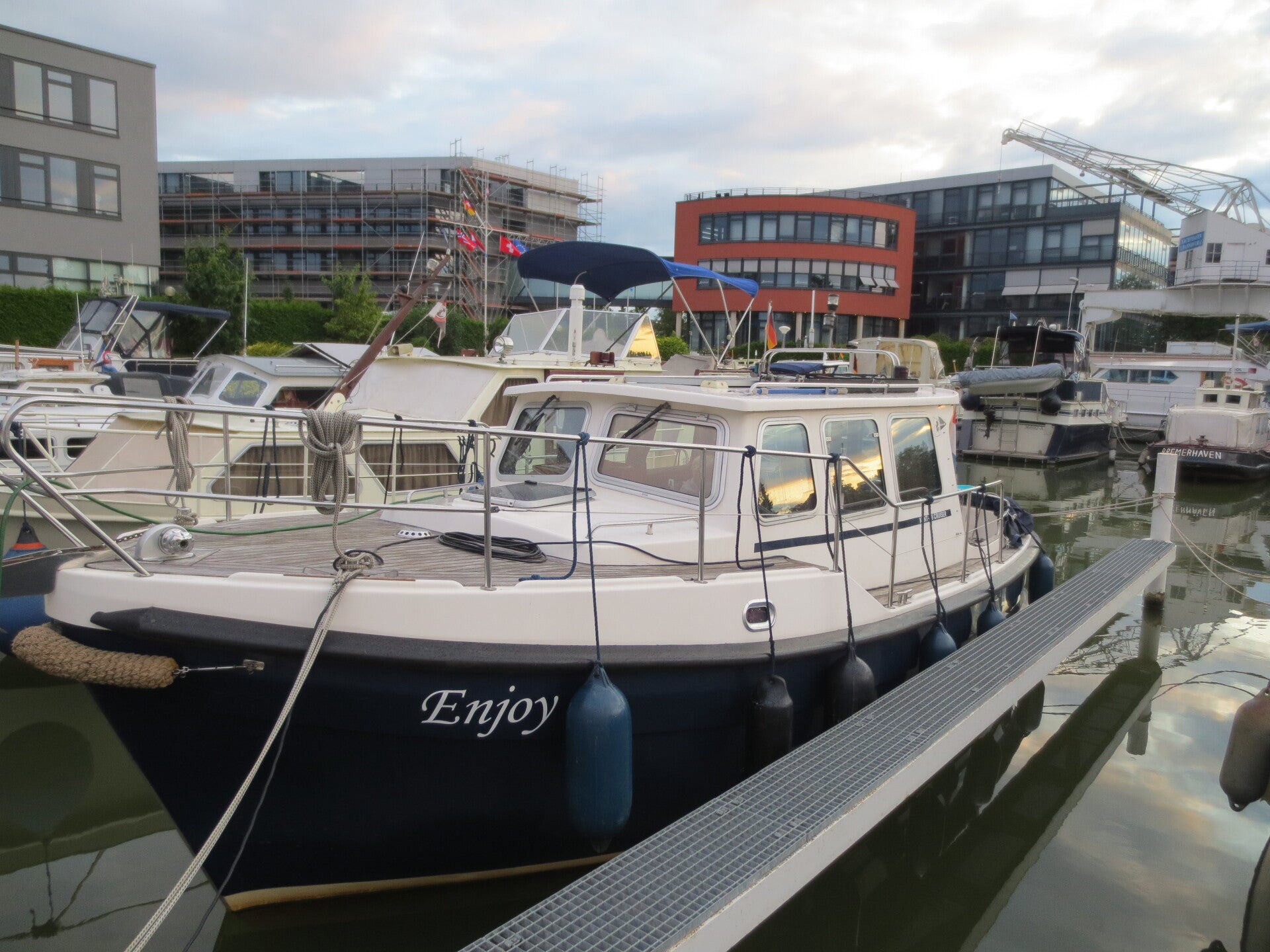 Ons konvooi bestond uit alleen onze boot. Vanmorgen om 07.30 uur werd de sluis opengezet en gespoeld. De sluis lag vol met blad en kapok. De vriendelijke sluiswachter Freddy vertelde ons dat hij dat om 09.00 uur geschut zouden worden. Freddy vertelde mij dat de volgende bruggen en sluizen door medewerkers uit een andere gemeente worden bediend rond 12.00 uur. Bij de brug was een mooie steiger en een brandstofpomp (Avia). Hier heb ik diesel getankt met de jerrycans op de steekwagen. Om 10.30 uur kwamen er 2 boten van de andere kant en wij konden hierna door de brug en in de sluis. De sluis werd geschud en wij moesten wachten op de lunchpauze van de twee sluiswachters. Kaye is tijdens onze stop in de sluis naar de warme bakker gelopen voor heerlijke broodjes. Om 11.40 konden we verder door de spoorweg ophaal brug. Om 13.30 uur waren we door de laatste ophaalbrug. Totaal hadden we 4 sluizen en 7 ophaalbruggen. De sluizen en bruggen worden met de hand bediend door meestal dezelfde sluiswachter. Volgens ons hadden die twee onenigheid. De vaste bruggen waren allen 4 meter hoog. We kregen ook te horen dat we maar 5 km/uur mochten varen terwijl er 7 km/uur was aangegeven. Ondiepste stuk op onze dieptemeter was 1 meter. Onderweg nog even aangemeerd doordat de temperatuur van de motor opliep. Het wierfilter schoongemaakt en aanzuig opening doorgeblazen. Om 14.00 kwamen we op het Küstenkanal. Om 17.00 uur gingen we alleen door de sluis in Oldenburg. Hierna hebben we in de haven van OYC in de Hunte aangemeerd. OYC is een mooie en goede haven.