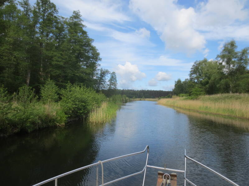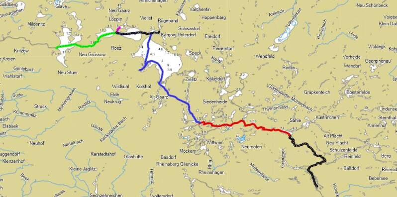 Onze route verliep anders dan gepland. Door de lage waterstand in de Elbe konden we niet door het Müritz-gebied van west naar oost varen. In plaats daarvan zijn we bij Liebenwalde - Stadt Am Finowkanal, ten noordwesten van Berlijn, het gebied binnengevaren tot aan Plau Am See. De afstand tussen Liebenwalde en Plau Am See is ongeveer 150 km. Bij Plau Am See keerden we om en voeren we terug naar Liebenwalde. Wat ons betreft is dit een indrukwekkend en prachtig merengebied dat zeker de moeite waard is om te verkennen.