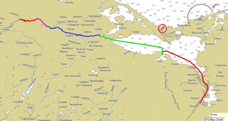 Eerst een flinke wandeling gemaakt. We zagen op het weerbericht dat het na zondag onstuimig weer zou worden voor 7 dagen op Rügen - veel wind op de Oostzee. Dus hebben we besloten om terug te gaan naar Stettiner Haff of Zalew Szczecinski regio. De bedoeling is om zondag naar Swinoujscie te varen en hier een tijdje te blijven voor de harde wind. De terug reis was een rustig zeetje. Toen we in de Peenestrom (een groot meer 4 km breed en 9 km lang met in het midden een vaargeul) voeren kwam er een politie boot in de verte met een noodgang aan met een blauwe zwaailamp. Bleek dat hij ons moest hebben. Hij begon te toeteren toen hij dichtbij kwam. Ze kwamen naast ons varen en door de luidspreker werd er ons verteld in het engels dat we netjes rechts in de vaargeul moesten varen. Hoe ze konden zien dat we niet netjes in de vaargeul zaten is een raadsel. Ze kwamen bijna haaks naar ons toe over het meer (buiten de vaargeul). We waren de enigste boot buiten de politie boot op het hele meer. Ik heb op de kaart gemeten dat de vaargeul 43 meter breed is en de betonning precies 1 km uit elkaar lag. Dat is makkelijk om rechts te houden!!! We zeiden oke en zijn gewoon weer verder gevaren. Waarschijnlijk had hij nog niets voor zijn dagrapport. Vlak bij de Zecheriner brug geankerd samen met wat andere boten.