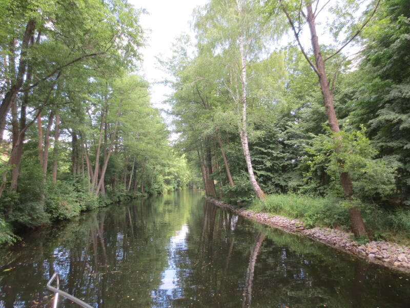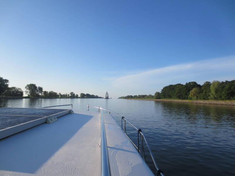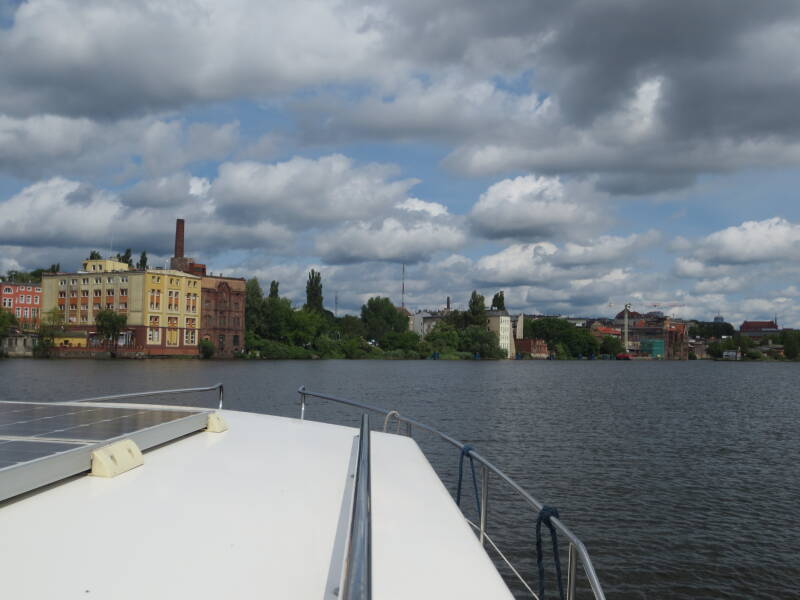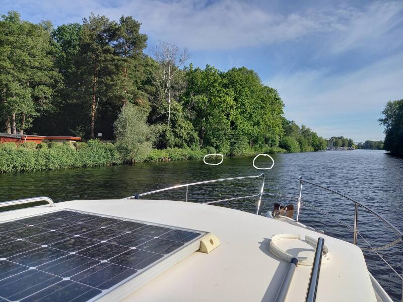 Vanmorgen met mooi weer vertrokken. In de middag nog even naar de Grosser Wusterwitzer See gevaren. Dit is een meertje wat te bereiken is via een ondiep geultje. Het stroomde hard in het geultje naar buiten. We durfden niet op het meertje te blijven omdat we bang waren dat het niveau te ver zou zakken zodat we niet meer weg konden. Hierna gevaren tot aan Plaue.