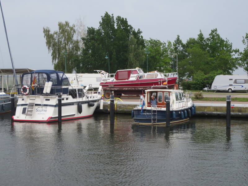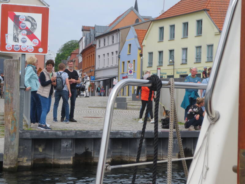 Vandaag gevaren naar Waren. Een leuk oud plaatsje waar een havenfeest aan de gang was. We zagen meerdere keren mensen die op een bankje zaten wijzen naar onze vlag en hoorde hun zeggen Hollander. Wij hadden al opgemerkt dat we in dit gebied nog geen Nederlandse vlag hadden gezien op een boot. We hebben een mooie rondwandeling tussen het feest gebeuren gemaakt. Om 06.00 uur was het afgelopen en begonnen ze de attracties af te breken. Wat ons verwonderde is dat het reuzenrad met 4 personen in 6 uur tijd werd afgebroken.