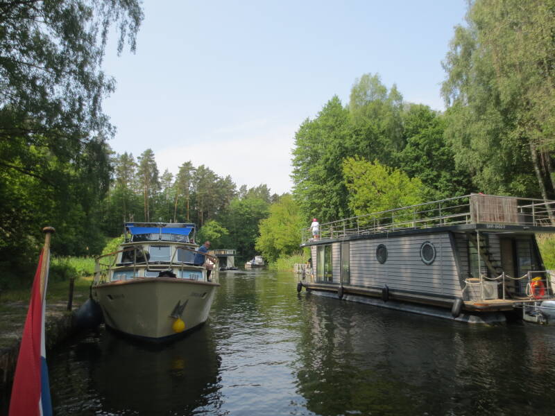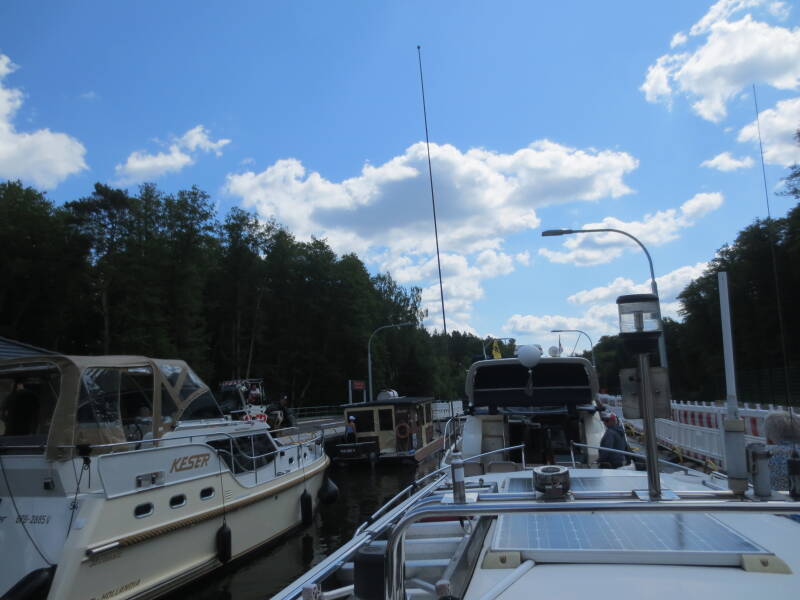 Om 07.30 uur vertrokken. Bij sluis Canow hadden we een opstopping met 2 boten en 5 House boats. De sluis was defect. We hebben twee uur gewacht totdat we erin konden. We waren de 2e lichting. We spraken mensen onderweg uit Berlijn die al eens mee hadden gemaakt dat een sluis langdurig defect was en dat ze moesten omvaren via Dömitz om over de Elbe naar Berlijn te komen. Dit geeft ons wel te denken want omvaren via Dömitz kan niet ivm het lage water op dit moment in de Elbe.