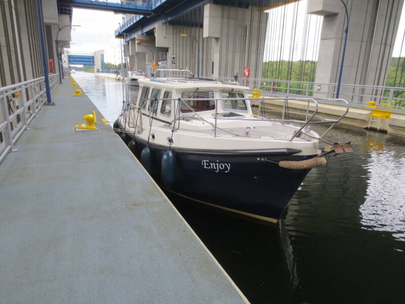 Om 07:45 uur vertrokken we vanuit Hannover. Het plan voor vandaag is om samen met de Schollevaer naar jachthaven Heidanger te varen. Bij sluis Anderten, met een hoogteverschil van 14,7 meter, moesten we kort wachten op een meevarend vrachtschip. Uiteindelijk lagen we met vier motorboten bij de wachtplaats van de sluis. Het schutproces verliep vlot, maar zorgde voor flinke golfbewegingen. We maakten de voor- en middenlijn vast aan de bolder, terwijl de achterlijn om de treden van een trap werd gelegd. Het was telkens een kwestie van op het juiste moment de lijnen overpakken. Na het uitvaren hebben we de lijnen schoongewassen, want die zaten onder de klei.