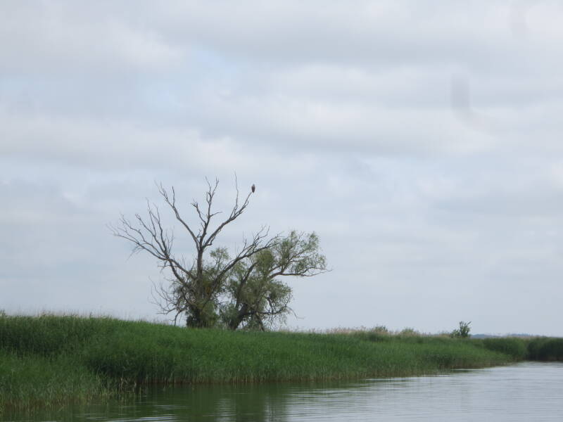 Om 07:30 uur vertrokken we uit Altwarp. In de ochtend zou er een rijdende kraan arriveren om een boot te water te laten, precies op de plek waar wij lagen. Daarom vertrokken we op tijd. De tocht over het grote meer verliep rustig en ontspannen. Toen we langs de oude, defecte Eisenbahnhubbrücke Karnin voeren, zagen we in de verte een Kent 27 Cruiser liggen bij de Anklamer Fähre. We zijn er even langs gevaren om een zo goed mogelijke foto te maken. Bij de monding van de rivier de Peene hebben we geankerd. Hier zagen we meerdere zeearenden in actie. Eén van hen pakte vlak naast de boot een flinke vis uit het water. Met de vis stevig in zijn poten en de kop naar voren vervoerd, vloog hij weg. Op de foto zijn er zelfs twee zeearenden te zien.