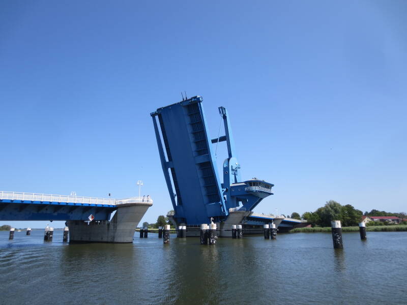 Om 08:15 uur vertrokken met een flinke stroming mee landinwaarts. Dit kwam waarschijnlijk door het opgestuwde water als gevolg van de harde oostenwind. Bij Anklam konden we nét onder de spoorbrug door. Op de kaart stond een doorvaarthoogte van 2,7 meter aangegeven, maar door het opgestuwde water was deze lager dan verwacht. We zijn doorgevaren naar Jarmen, waar we aan de kade hebben aangelegd voor de nacht, naast de campers. Hier hebben we de dieseltank bijgevuld en gelijk boodschappen gedaan.