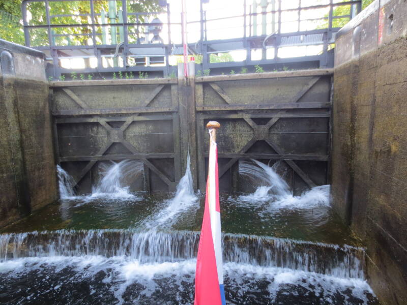 Om 07.15 uur vertrokken we richting de sluis in Haren, onderdeel van het Haren-Rütenbrock Kanaal, waar we wilden aanleggen in afwachting van de bediening om 08.00 uur. Bij het kleine steigertje is slechts ruimte voor één boot. Bij aankomst bleek er al een Duitse boot te liggen, dus hebben we naast hen aangelegd. Kort daarna arriveerden nog twee boten, die op hun beurt naast ons aanlegden. Precies om 08.00 uur konden we de sluis invaren. De Duitse bemanning naast ons was zichtbaar nerveus, omdat het hun eerste keer was door dit kanaal. Ze voeren met een grote boot en hadden de antennebeugel neergeklapt om door te kunnen. Ze vroegen ons om als eerste te gaan. In de sluis was slechts ruimte voor twee boten tegelijk.