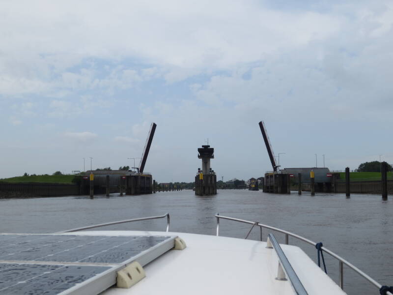 Bij de eerste sluis troffen we waarschijnlijk dezelfde sluiswachter als in 2019. Hij sprak alleen Duits. Terwijl hij "Duits!" riep, gooide hij meteen de haak erop. Vervolgens reageerde hij ook niet meer via de marifoon. We zijn achter een vrachtschip de sluis ingevaren, maar dat schip had moeite om de sluis uit te komen. Het leek vast te zitten in een dikke laag zand, want de schroef wierp enorme hoeveelheden zand omhoog. Na deze sluis vervolgden we onze tocht over de Eems en passeerden we nog drie sluizen. Hier was de communicatie gelukkig een stuk vriendelijker!